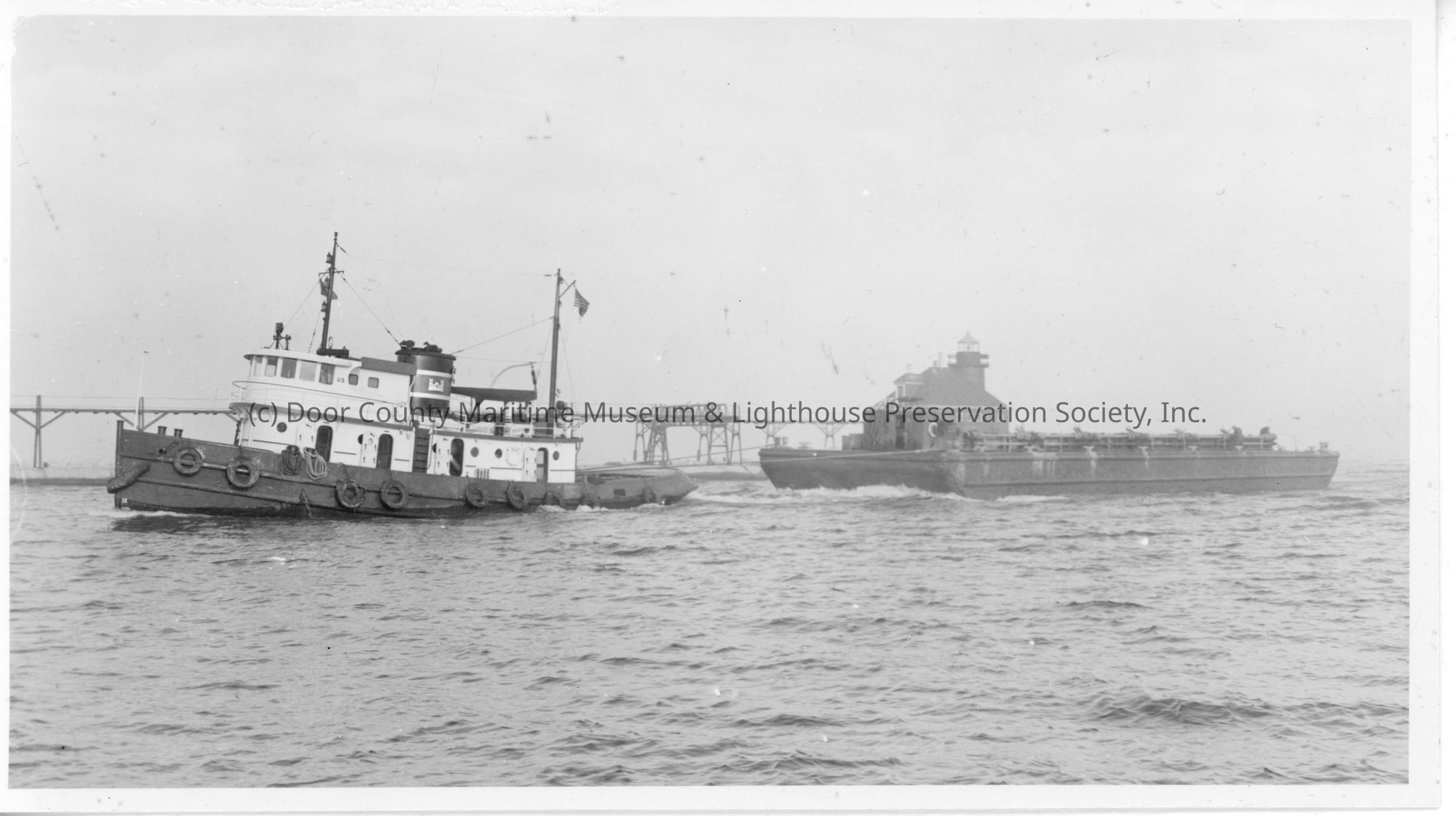 US Army Corps of Engineers tug towing barge past Sturgeon Bay Canal Pierhead LightEntry/Object ID