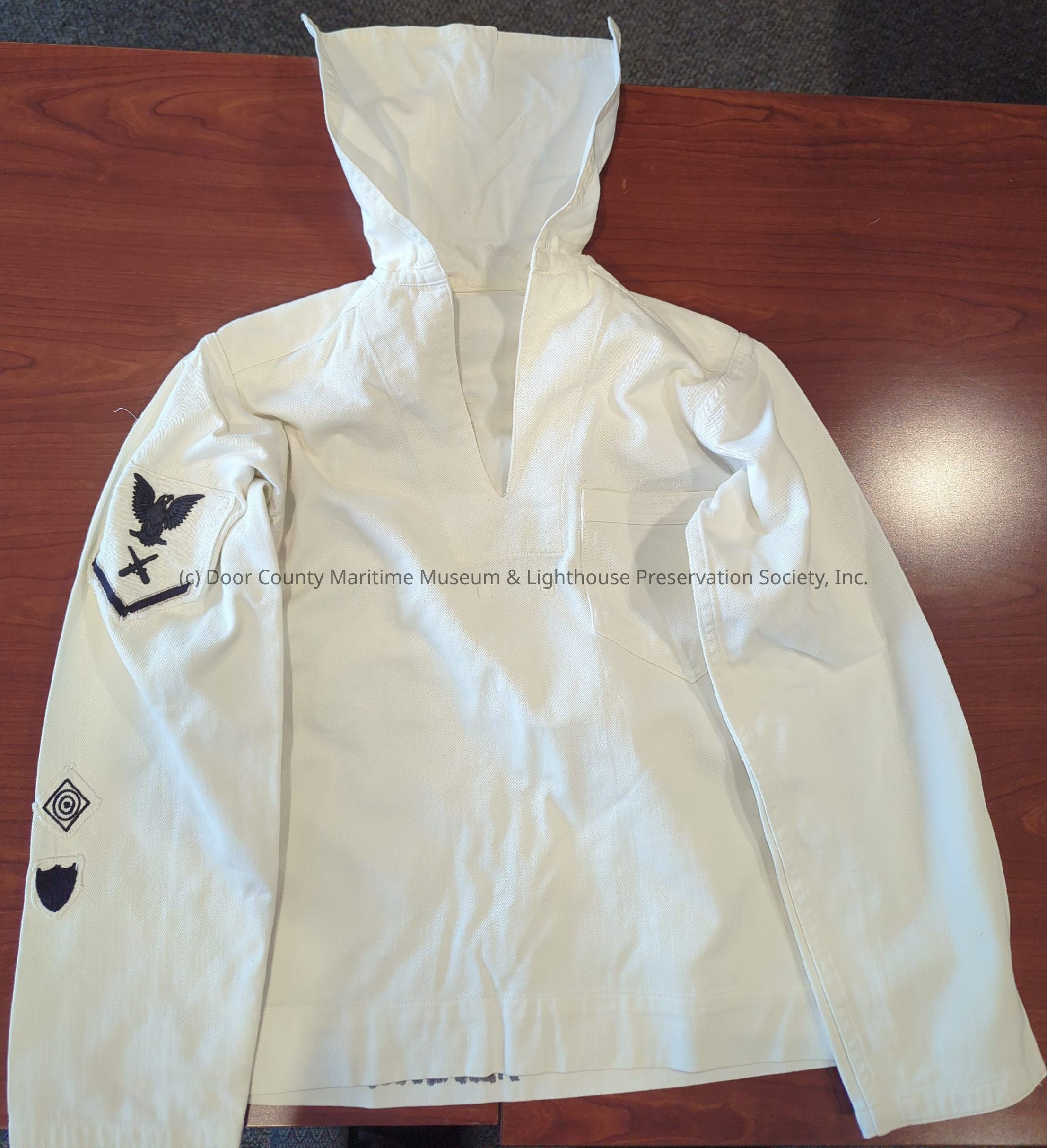 USCG uniform shirt: overall color white; 3rd Class Petty Officer Gunner's Mate patch on right sleeve (upper); two patches, small patches shield and target right sleeve forearm area.Location