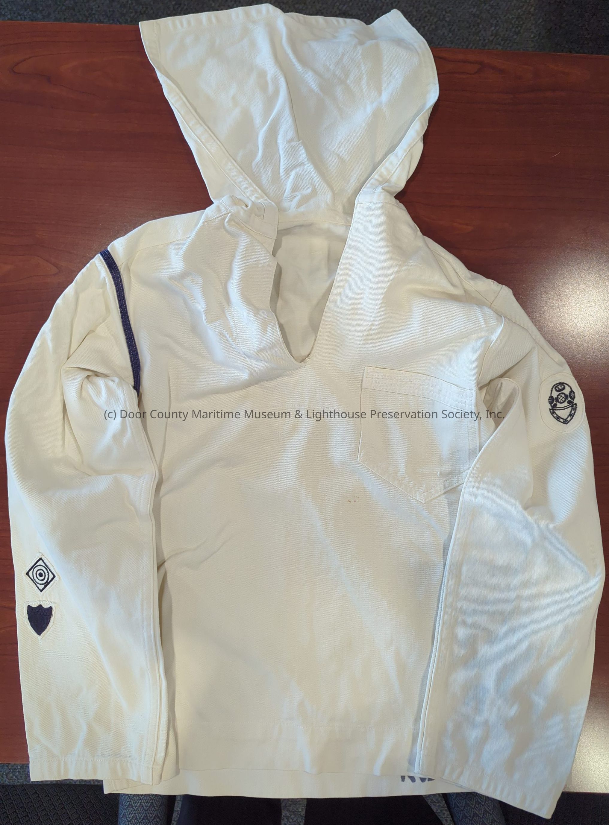 USCG uniform shirt: overall color white; divers patch left sleeve; blue 1/2" wide trim band right shoulder; "KLIMEK F." stenciled inside back waistband; two patchs on right sleeve forearm target and shield.Location