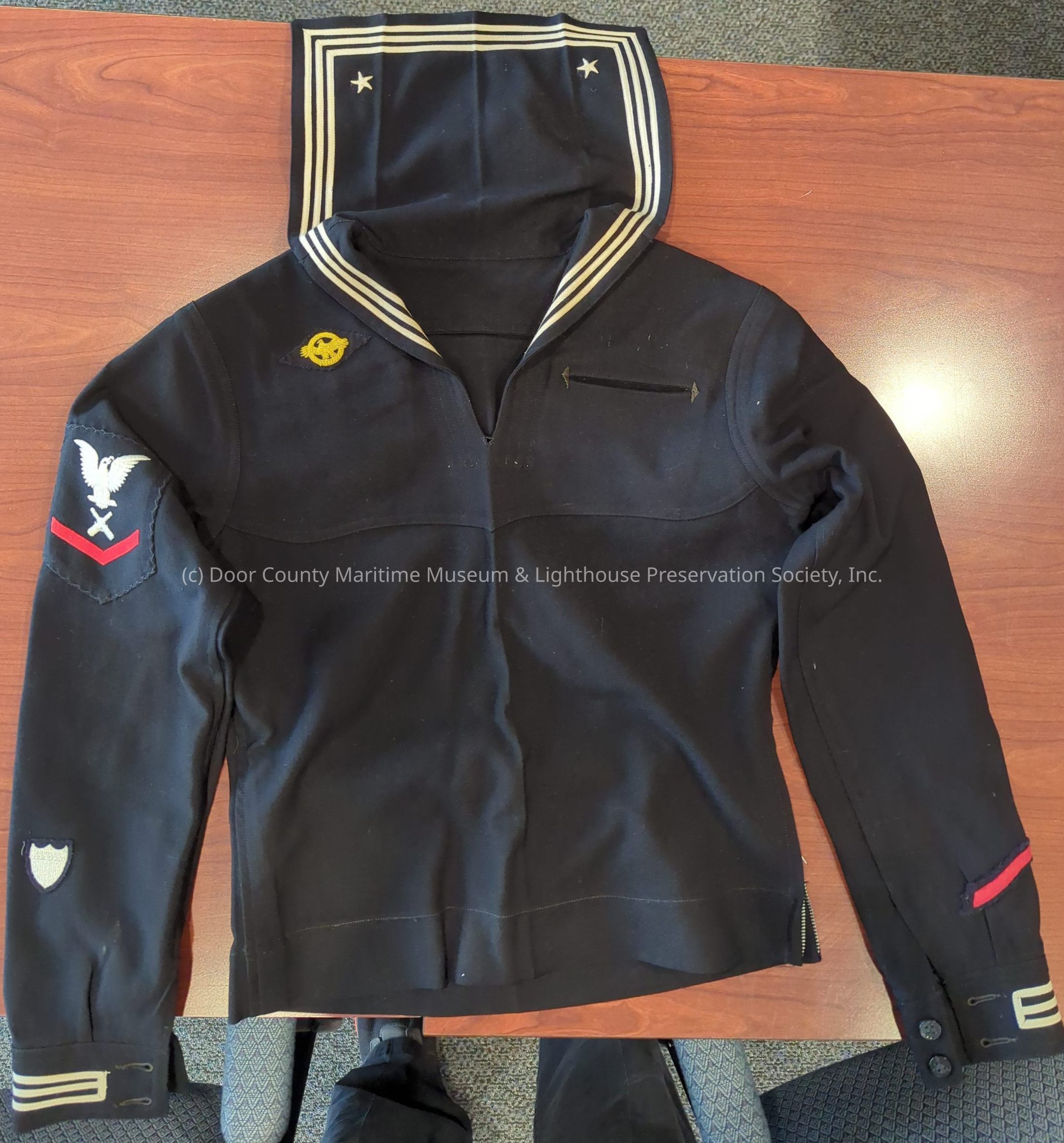 USCG uniform shirt: overall color navy blue; side seam zipper 12" length; three-stripe piping on collar and flap and sleeves; gold eagle patch right shoulder; 3rd Class Petty Officer patch (red and white) right sleeve; red slash bar left sleeve (length of service 4 yr.).Location