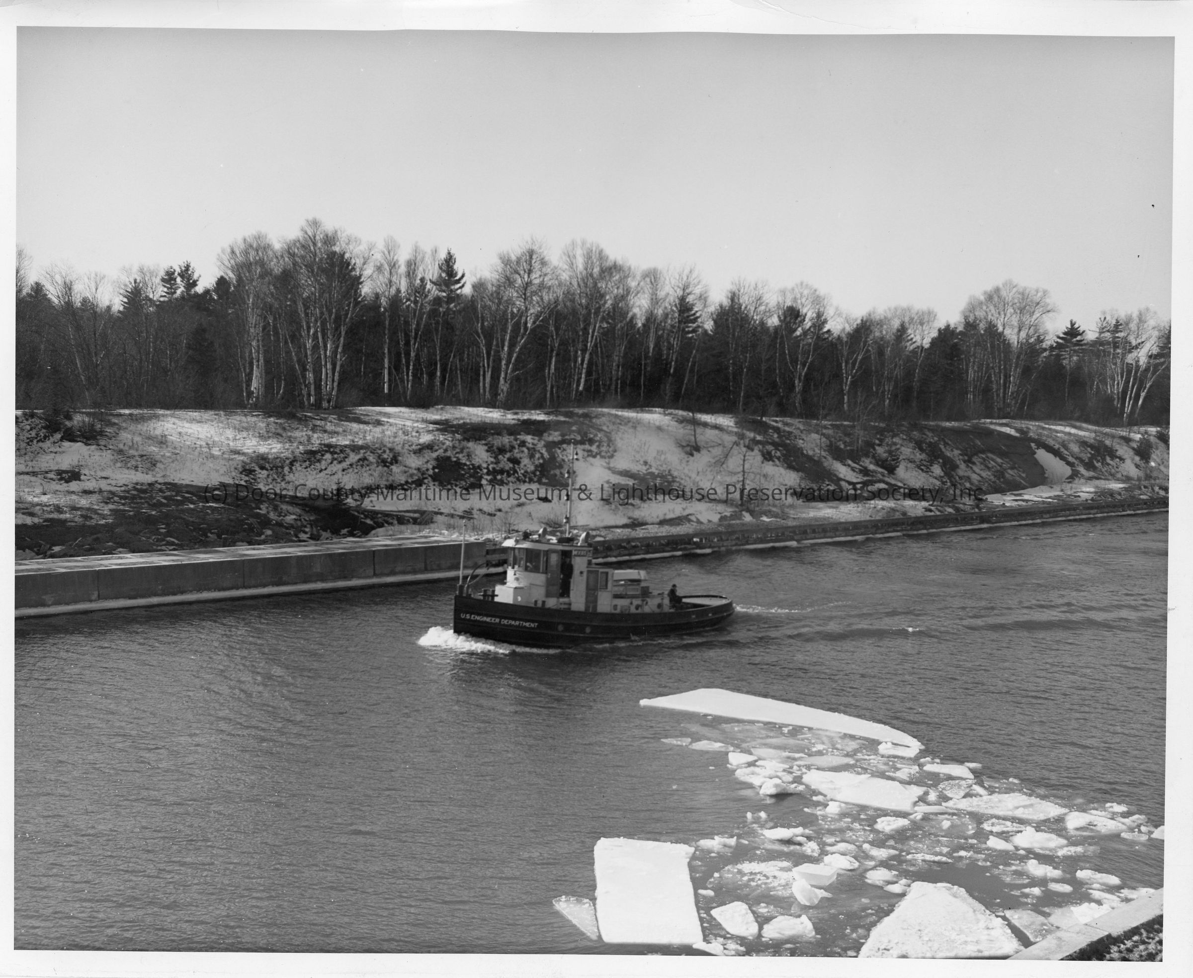 US Engineer Department tug underway in canal in winter