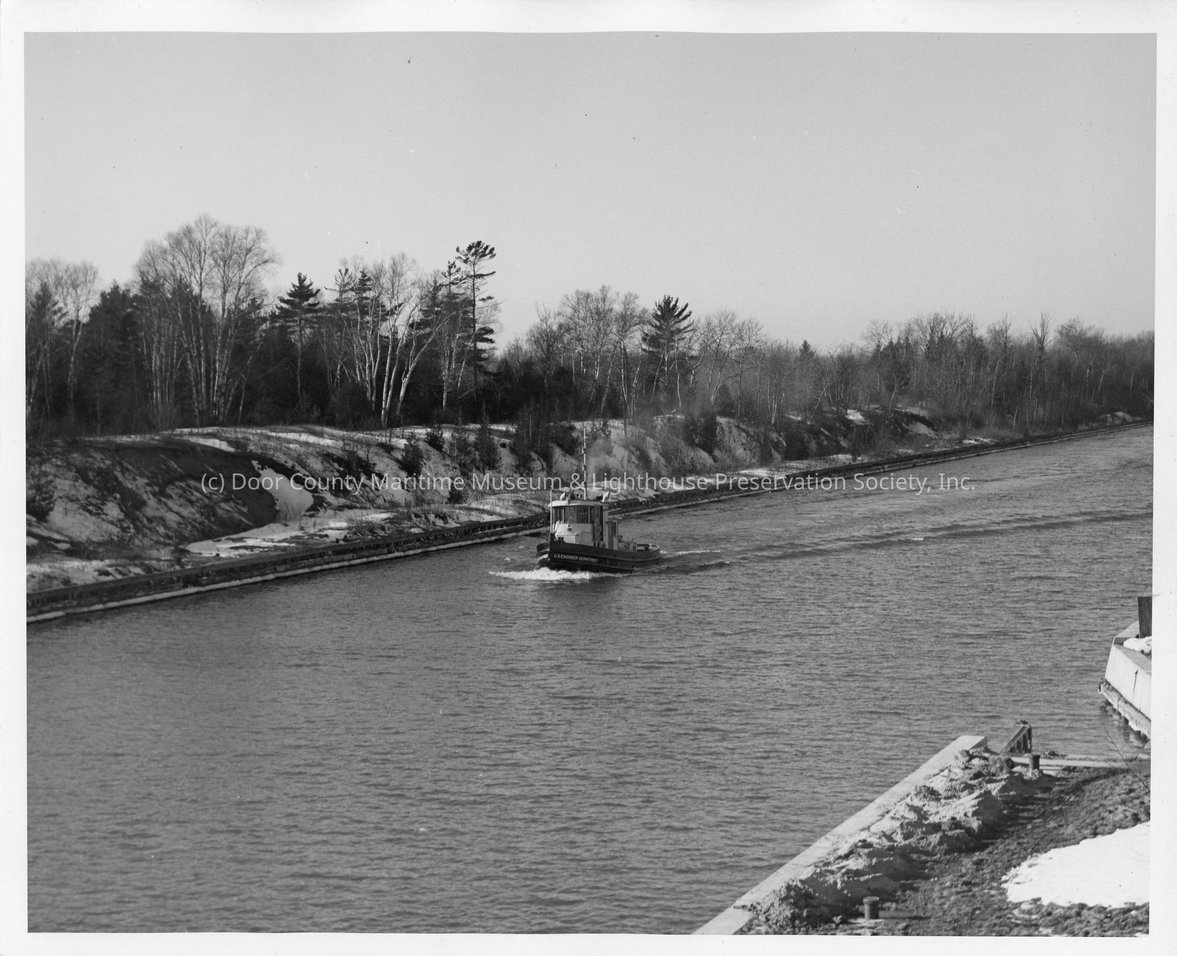 US Engineer Department tug underway in canal in winter