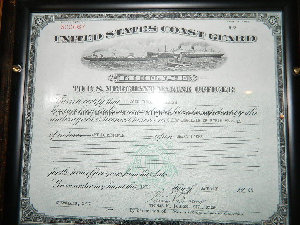 United States Coast Guard, Serial no. 300067, issue number 8-9; license to U.S. Merchant Marine Officer, John Theodore Arbter - chief engineer of steam vessels; black frame with glass;
