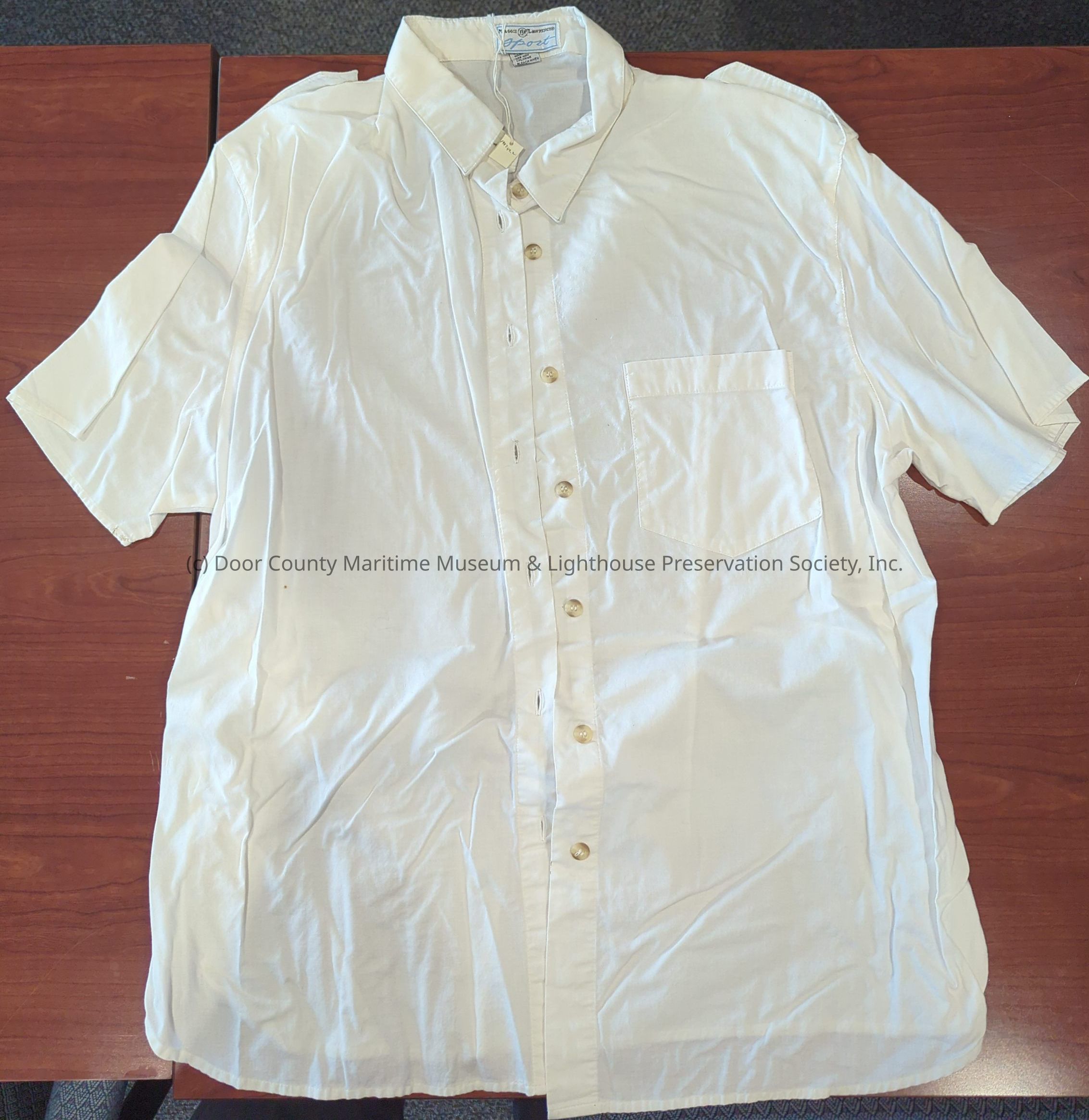 Blouse: white short-sleeved; 7 tan and white buttons down front opening; tabs on each shoulder; tan and white button; size 22-24.Location