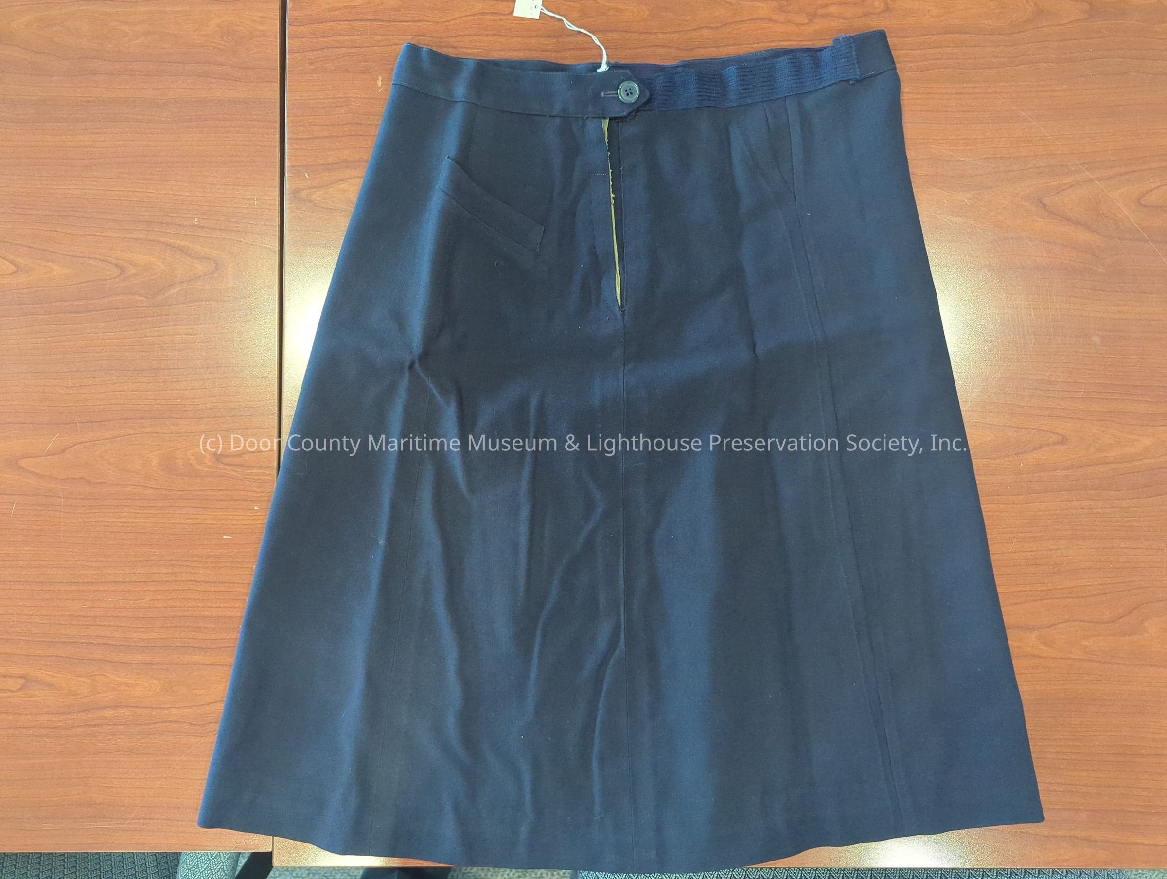 Skirt: navy blue; side zipper, navy blue button closure; 2 front pockets.