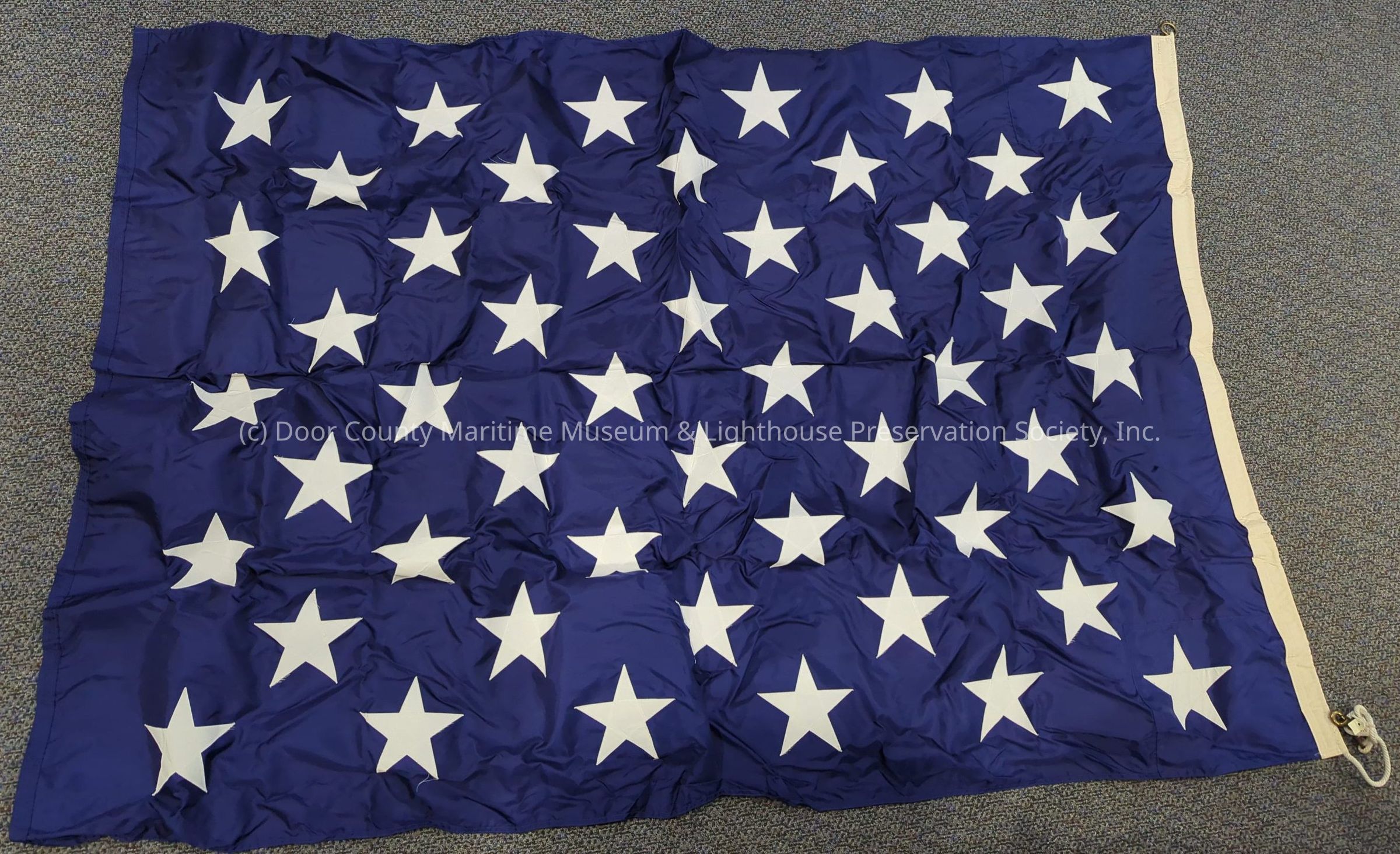 USA Union Jack flag; (flies from jackstaff at thebow of warships/USCG cutters when in port) blue field; 50 white stars; serial #8345-00-656-1448; white sleeve; white rope; metal ring; fasteners.Location