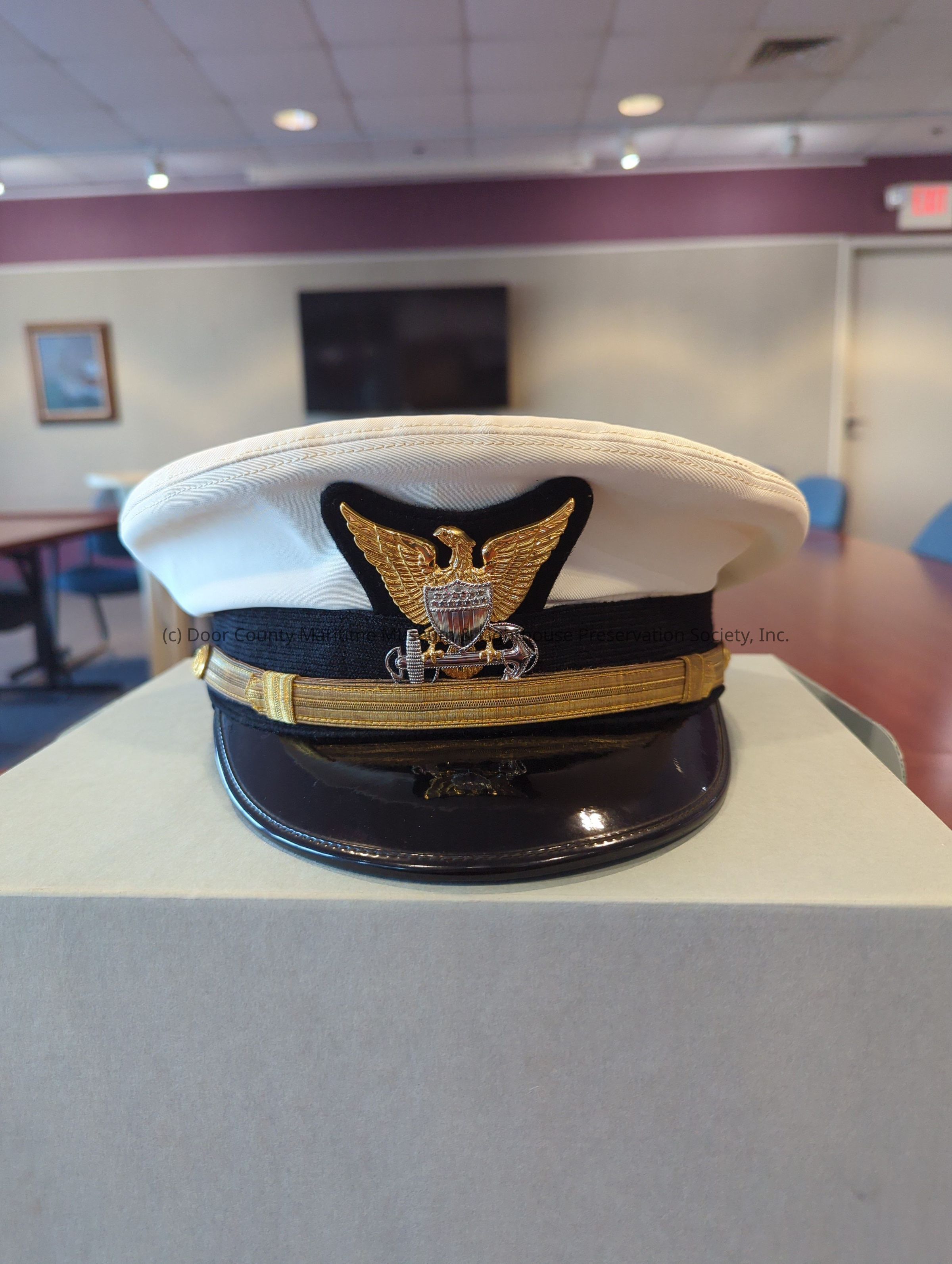USCG cap; overall color white; with gold trim and black brim; owner's name on card inside "Leon Arthur Anderson"; mfg. label inside top-A.G. Meier/Chicago.Location