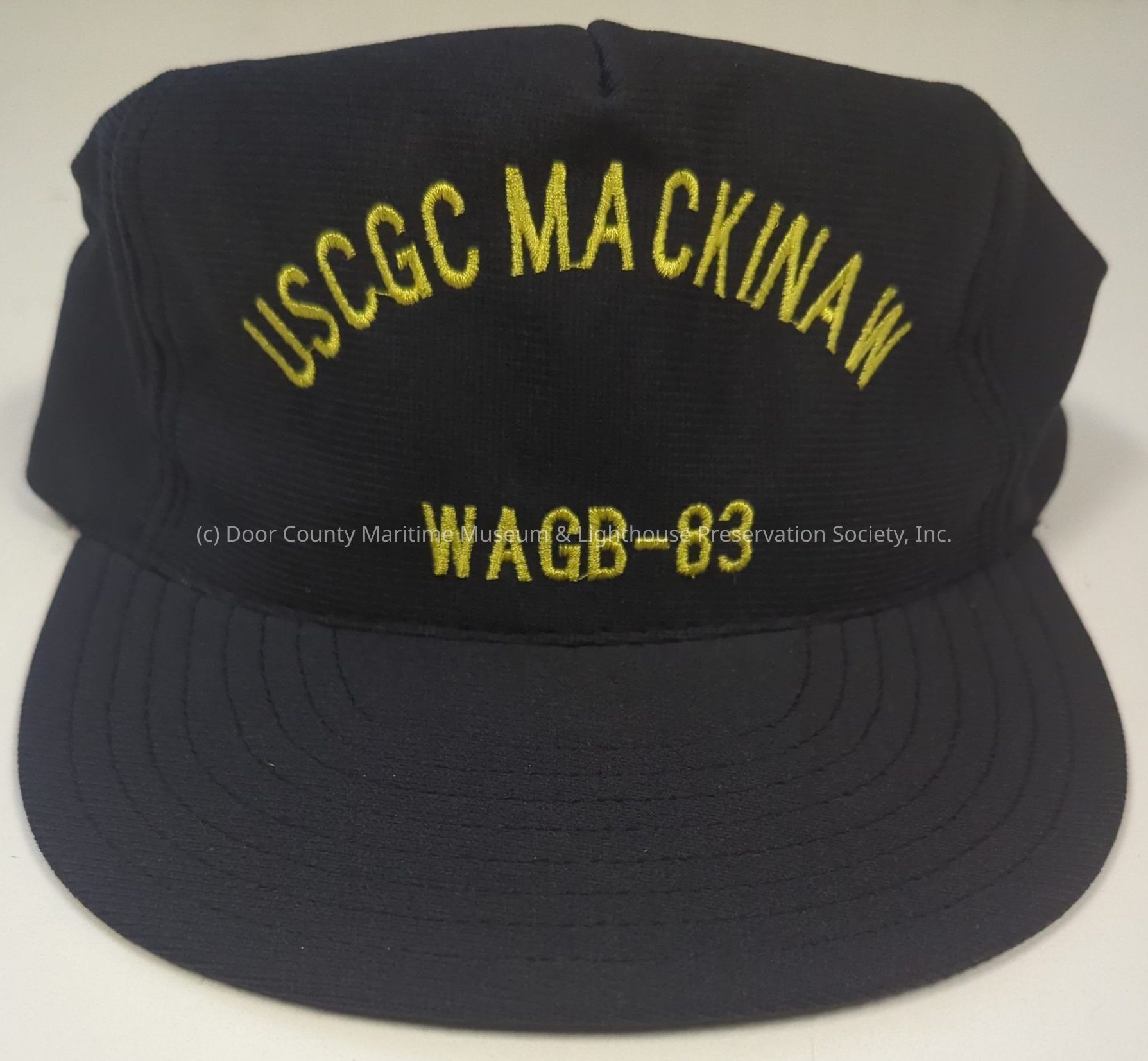 Cap: base-ball style; blackish-blue visor cap; yellow print on front "USCG Mackinaw WAGB-83"; blackish-blue plastic adjuster on back; partial white lining; label inside with flag and "Made in USA."Location