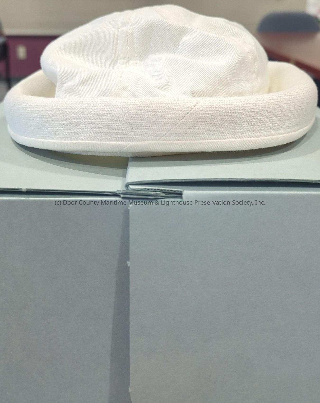 USCG service cap: overall color white; regular duty cover/design; (would be called typical "sailor" hat.)Location
