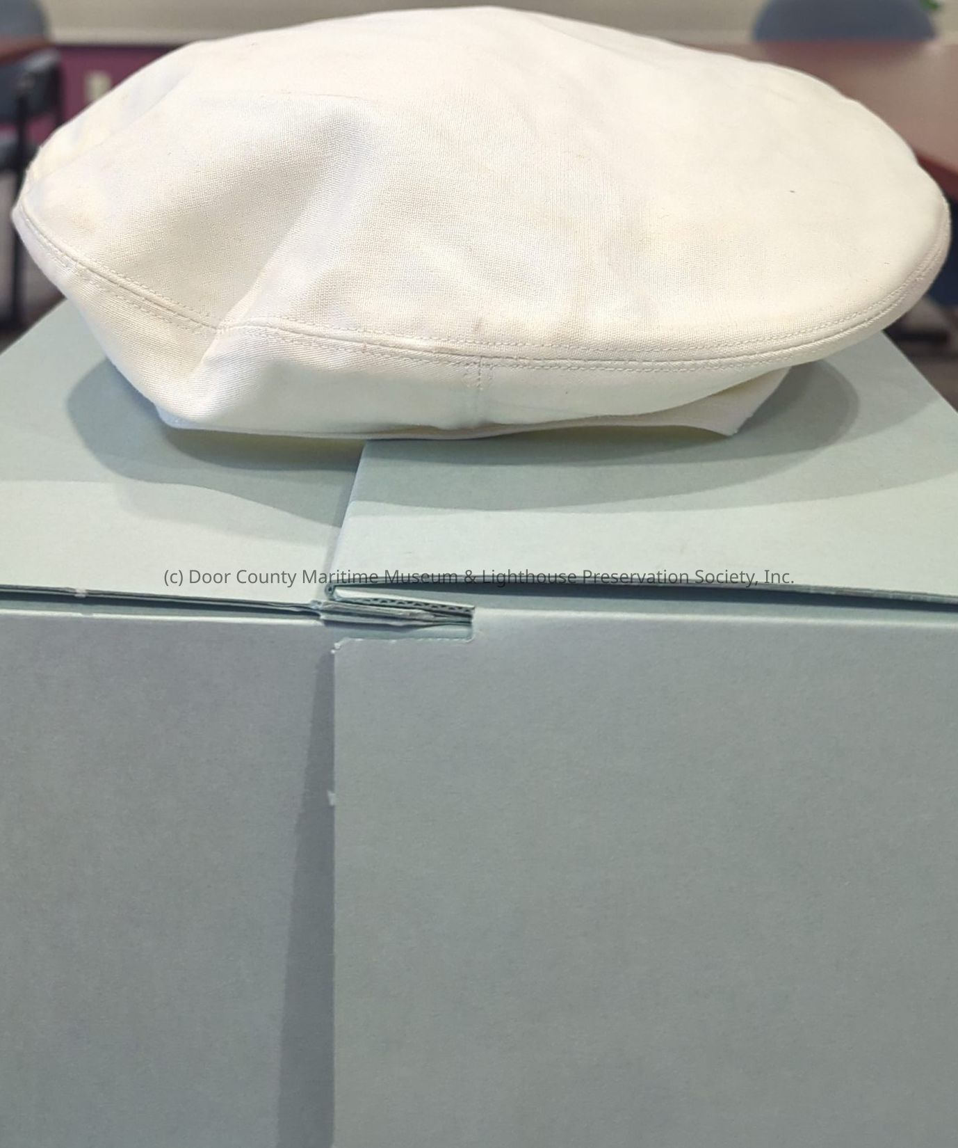 USCG service cap: overall color white with dark blue band and gold US Coast Guard copy; dress uniform hat; leather sweat band; rigid plastic interior form; inside: Art Cap logo and owner identification (Fulton,D.F.) with serial #359051 USCG.Location