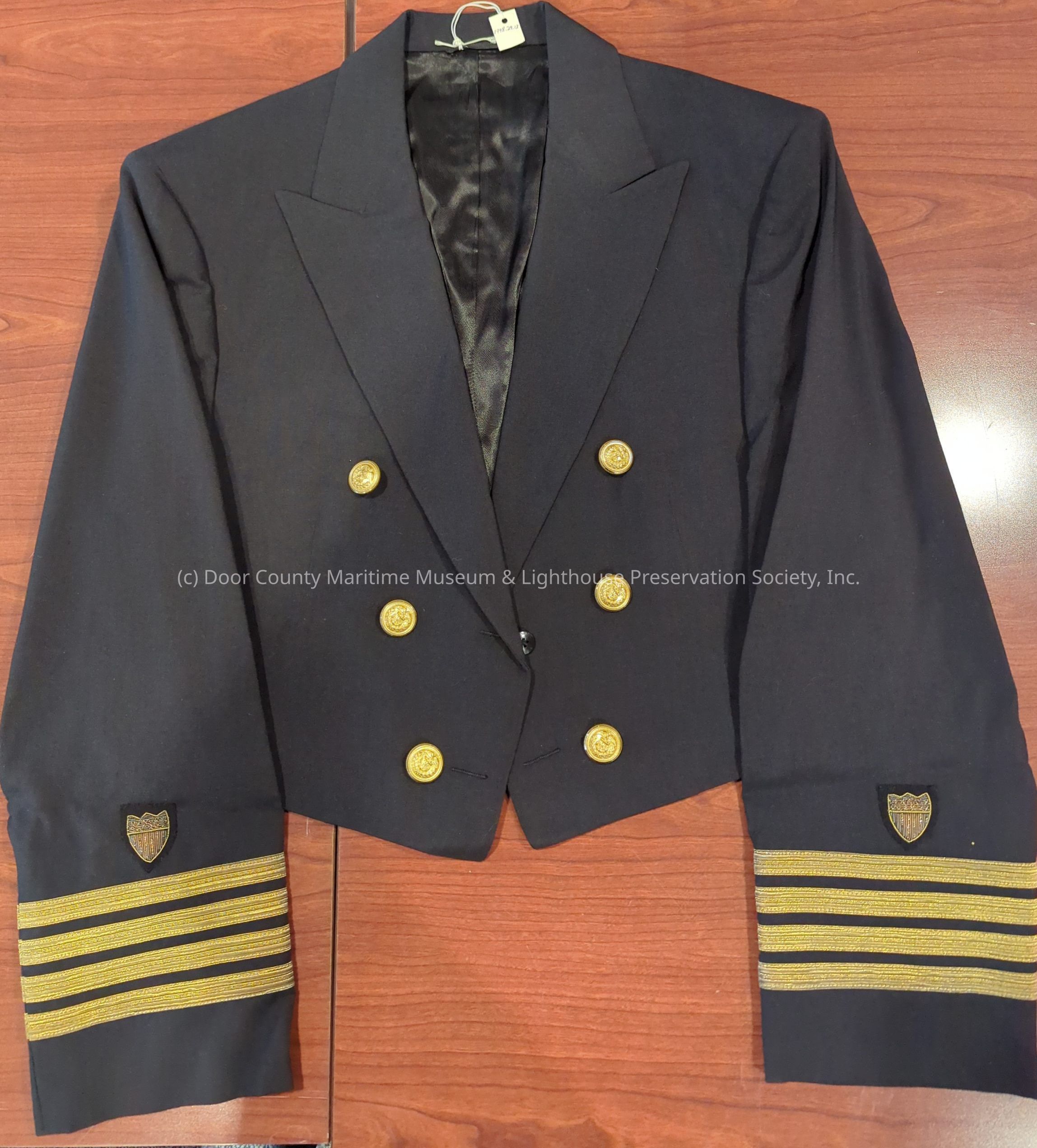 USCG uniform jacket: overall color dark blue; gold sleeve bars and 6 brass buttons; jacket is short and is held closed by 2 black buttons in center area.Location