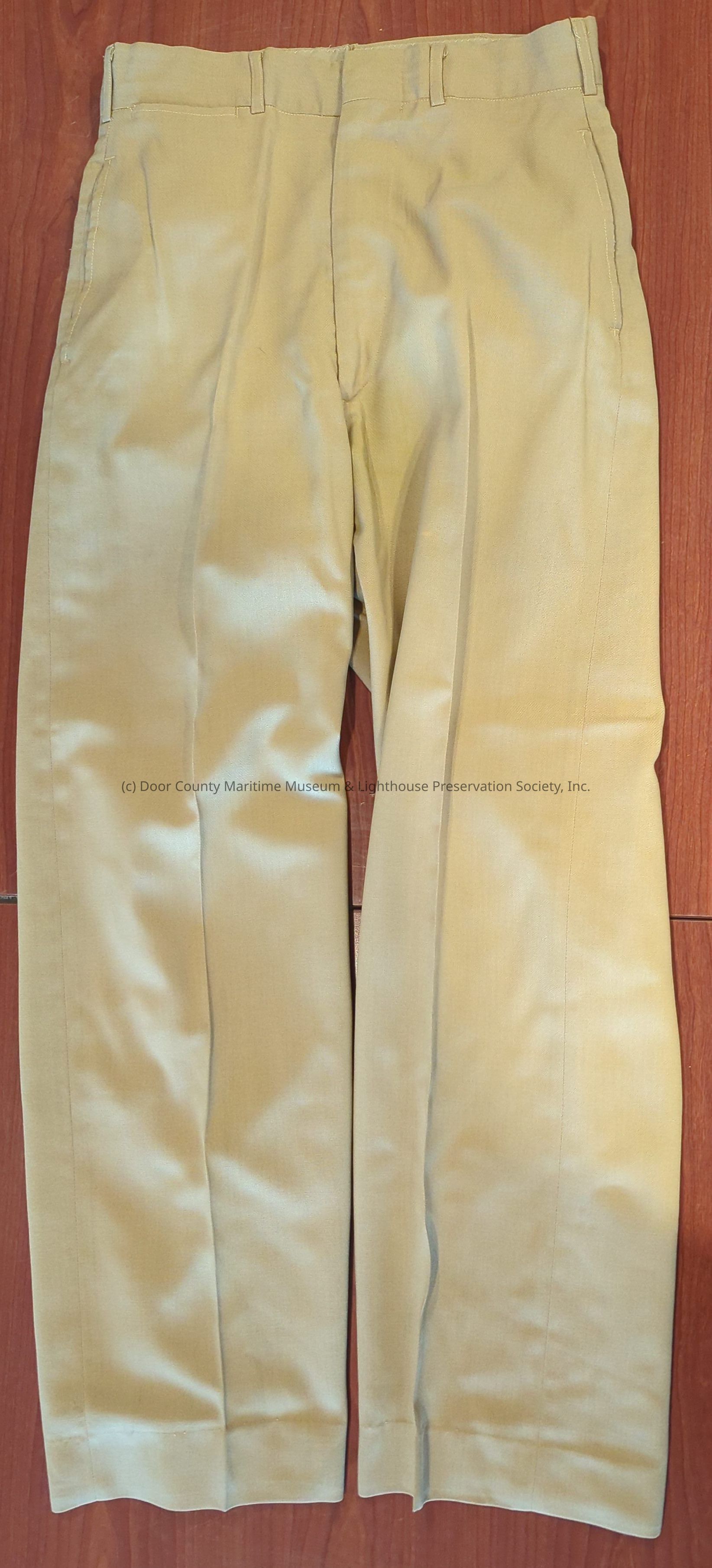 USCG uniform pants: overall color tan; belt loops; zipper fly; Creighton Shirt Co: dry clean only label inside near waist.Location