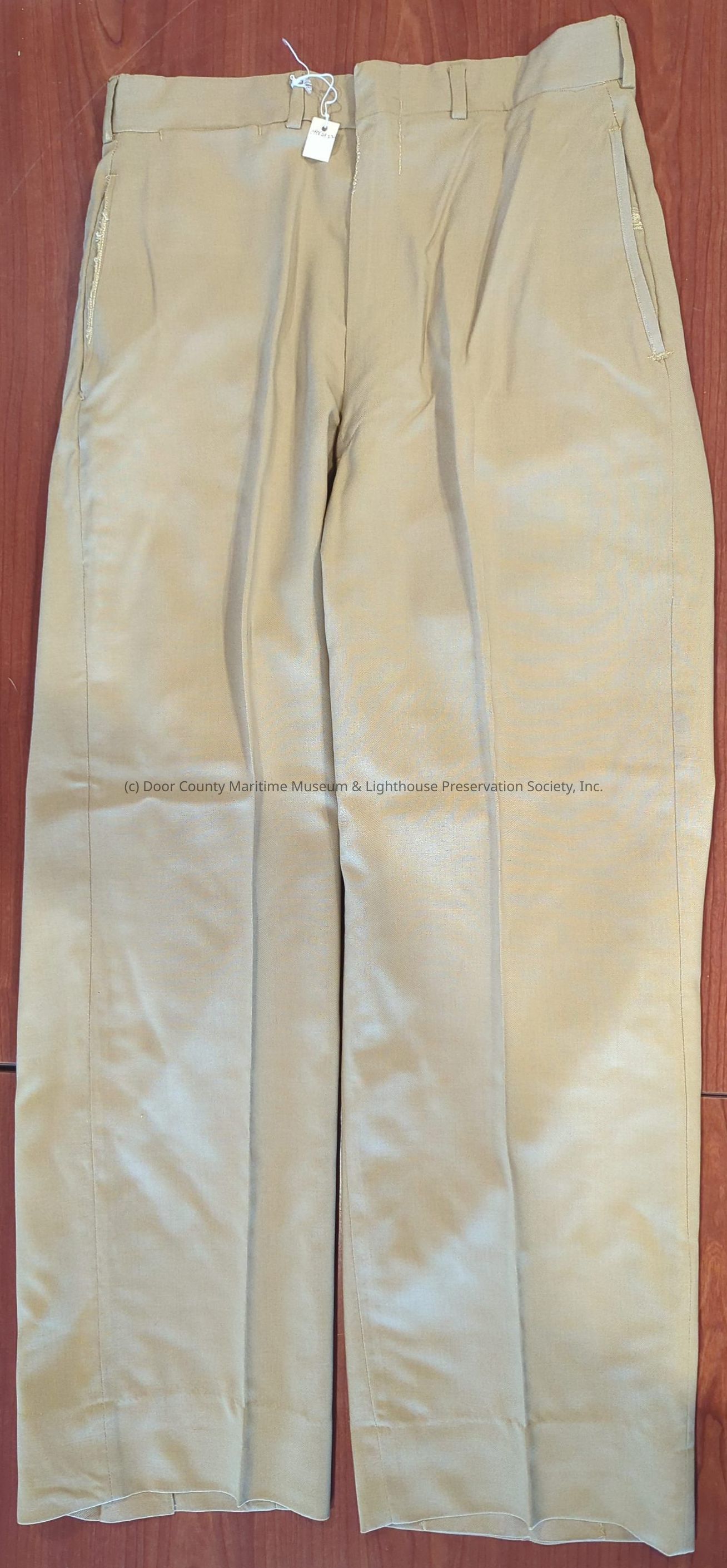 USCG uniform pants: overall color tan; belt loops; zipper fly.