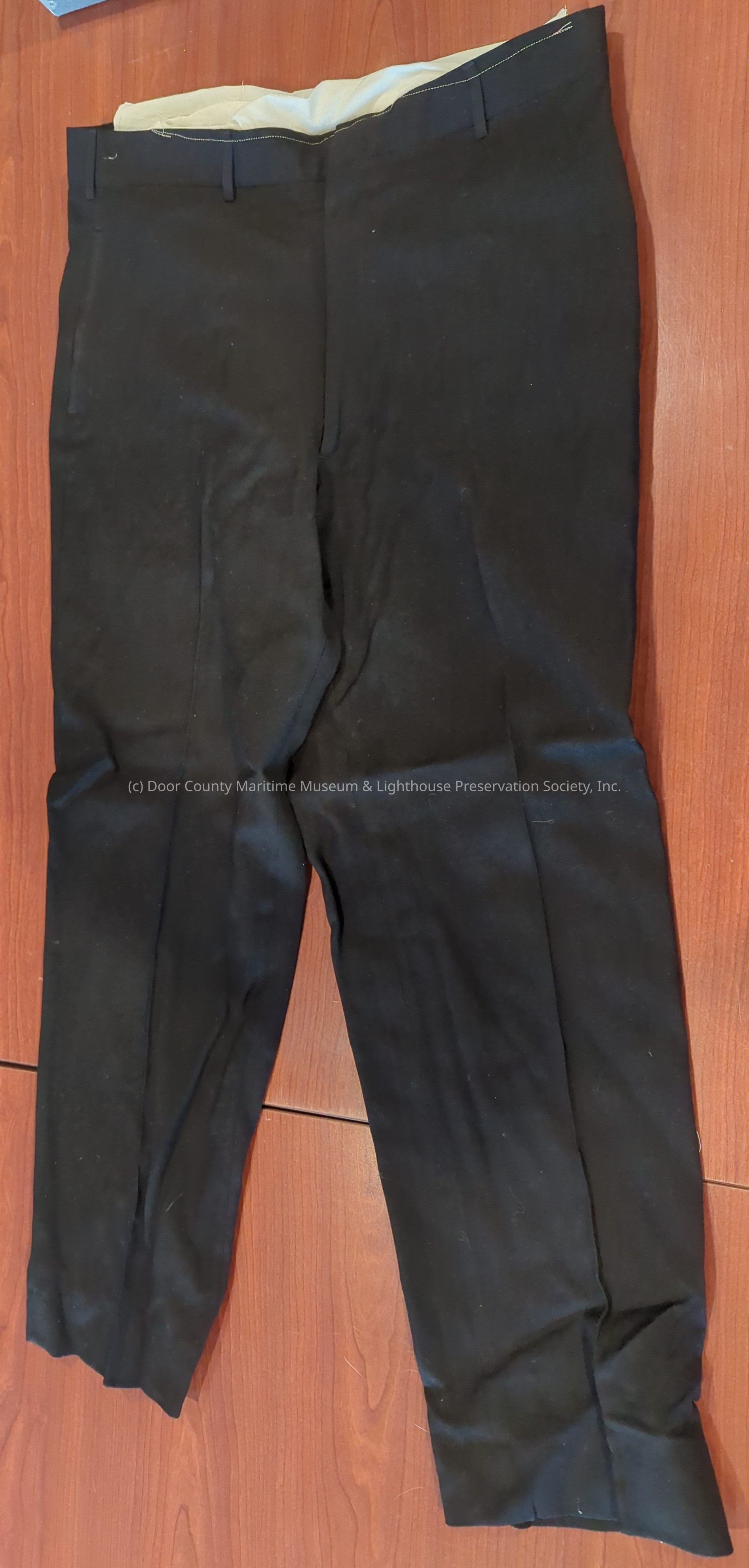USCG uniform pants; overall color dark navy blue; zipper fly; white band interior waist line; manufacturer's warranty label on interior pocket.Location