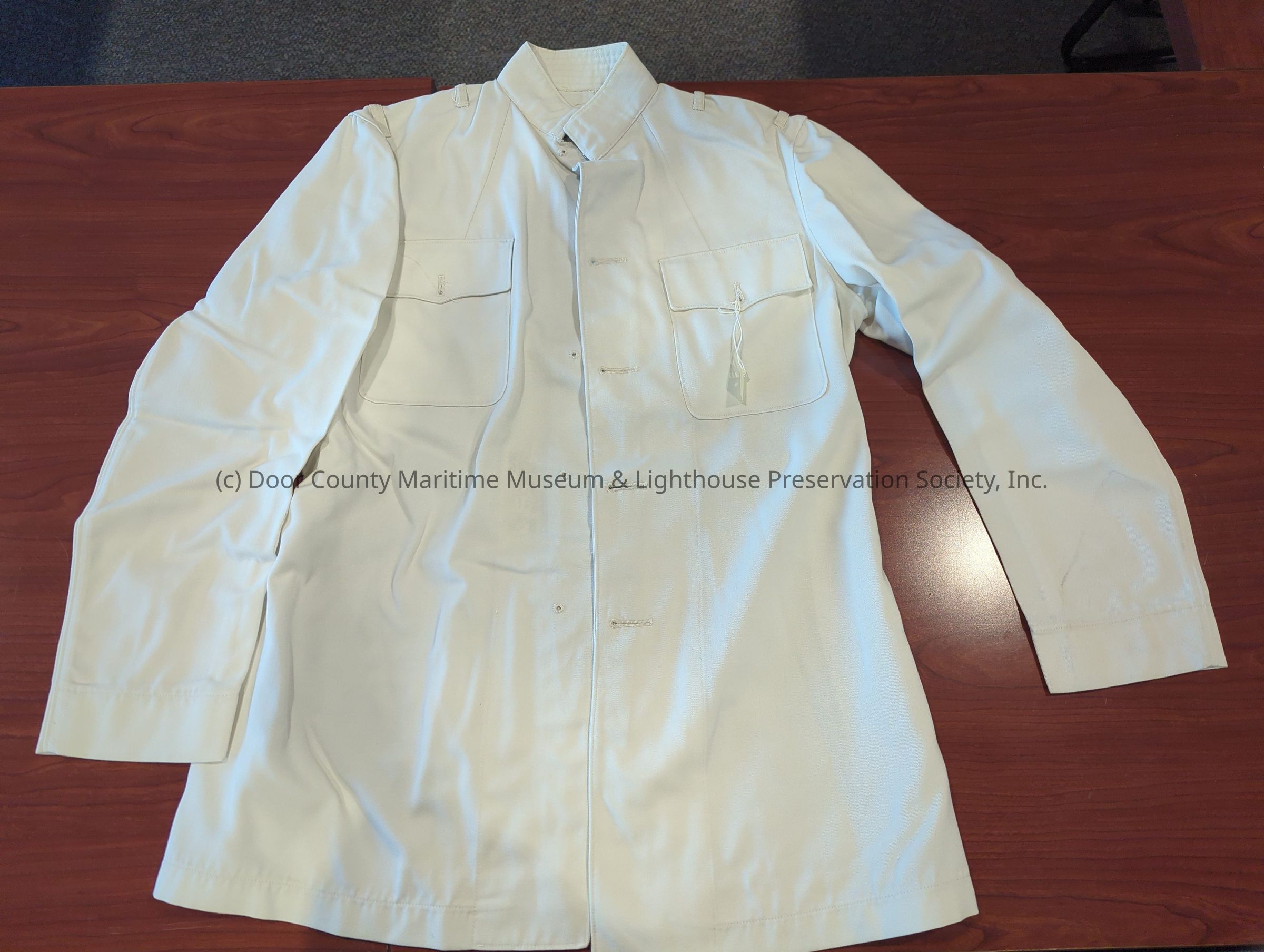 USCG uniform shirt: overall color white; 2 flapped top pockets (no buttons); 5 button holes (no buttons); high straight collar with 3 metal loop closures.Location