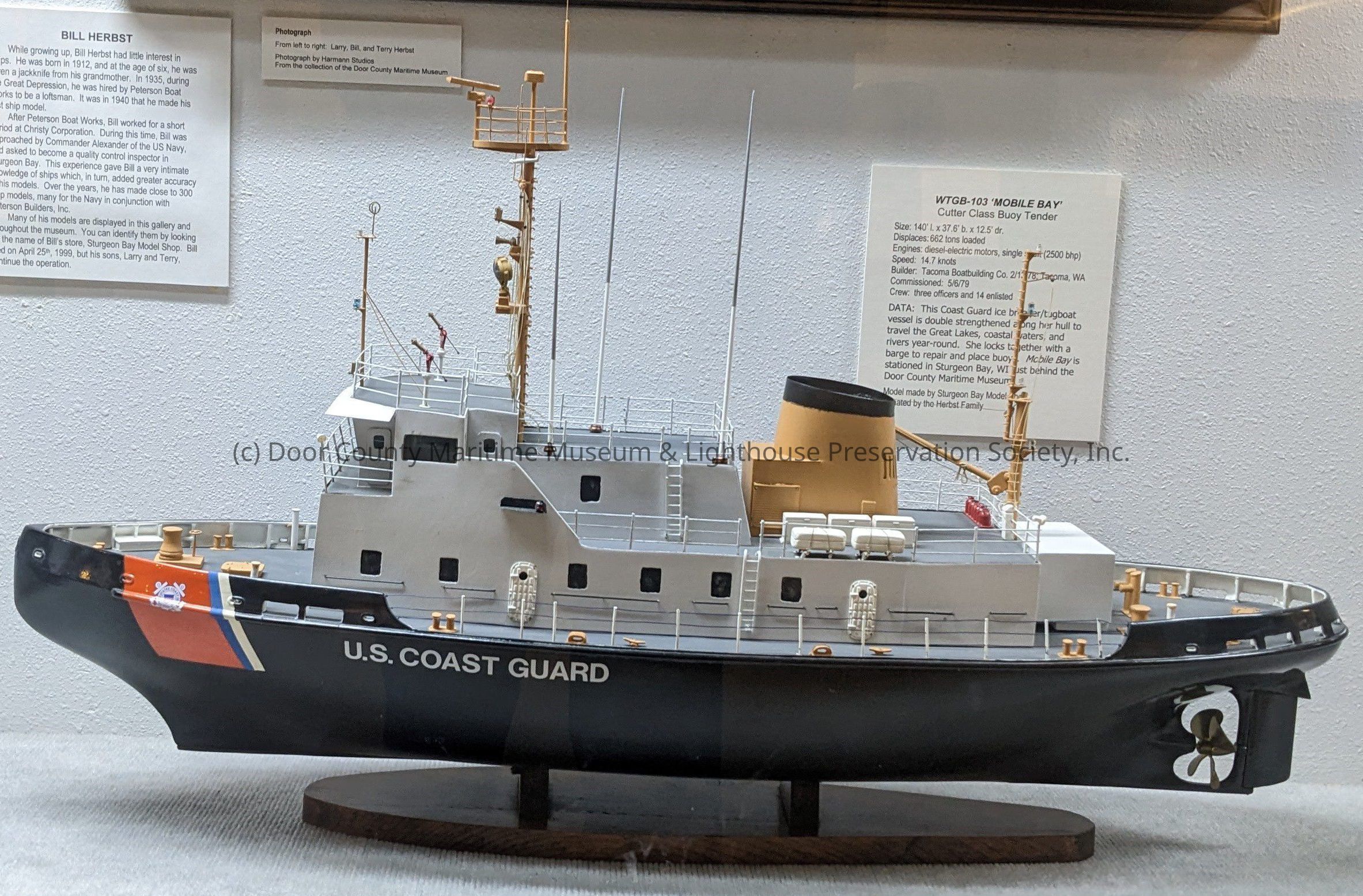 Overall color model black and gray with orange; US Coast Guard Logo and Name Port and Starboard bow area; single four blade brass propeller; glass protective case with wood frame and baseLocation