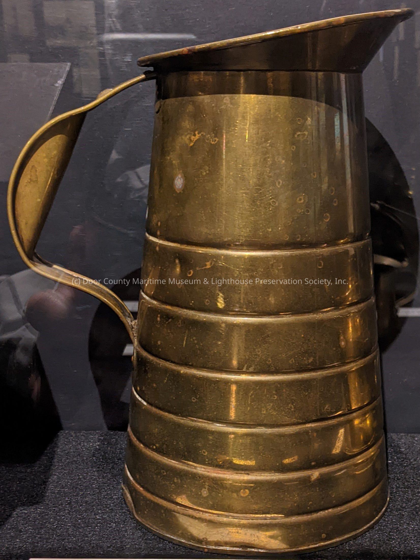 Three-quart U.S. Lighthouse Service brass oil measuring pitcher; U.S. Lighthouse Service engraved on bottom; measuring lines aound the pitcher indicating 1 Pt.; 1 Qt.; 3 Pts.; 2 Qts.; 5 Pts.; 3 Qts.; two slight dents near bottom; some gree and rust spots.