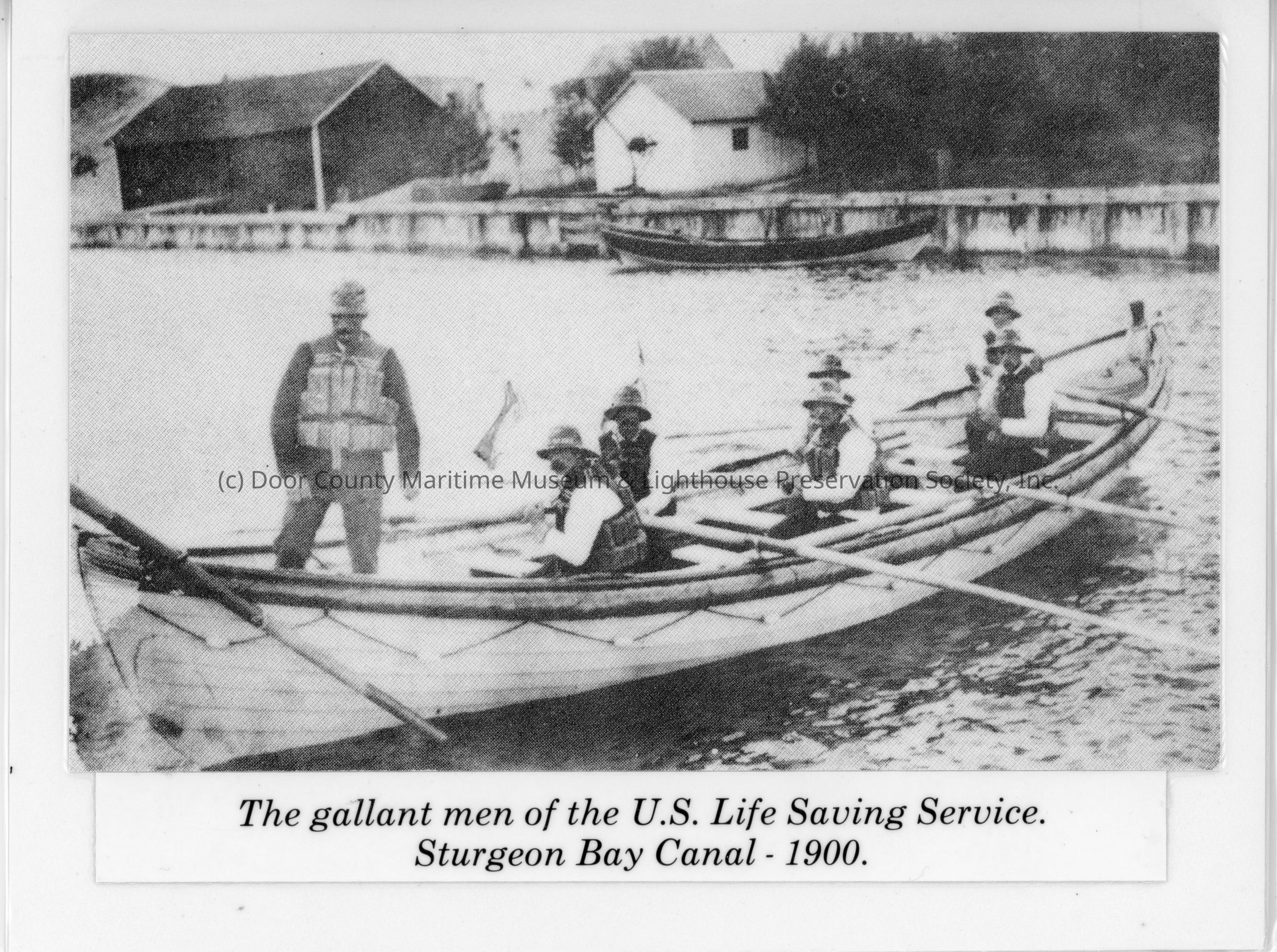 Seven men in cork life vests in surfboat. Man standing at bow. Boat in Sturgeon Bay Canal. text states "The gallant men of the U.S. Life Saving Service. Sturgeon Bay Canal. 1900Location