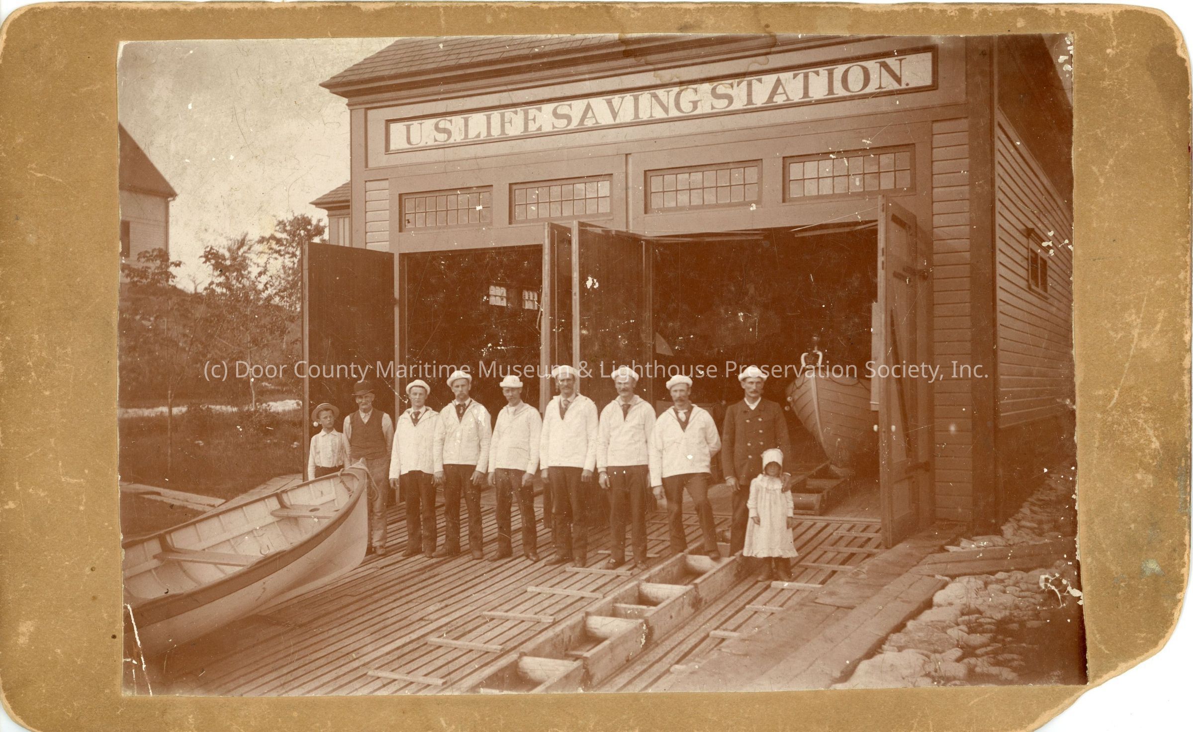 Group of people standing in front of the Sturgeon Bay Life Saving Station June 1894Location