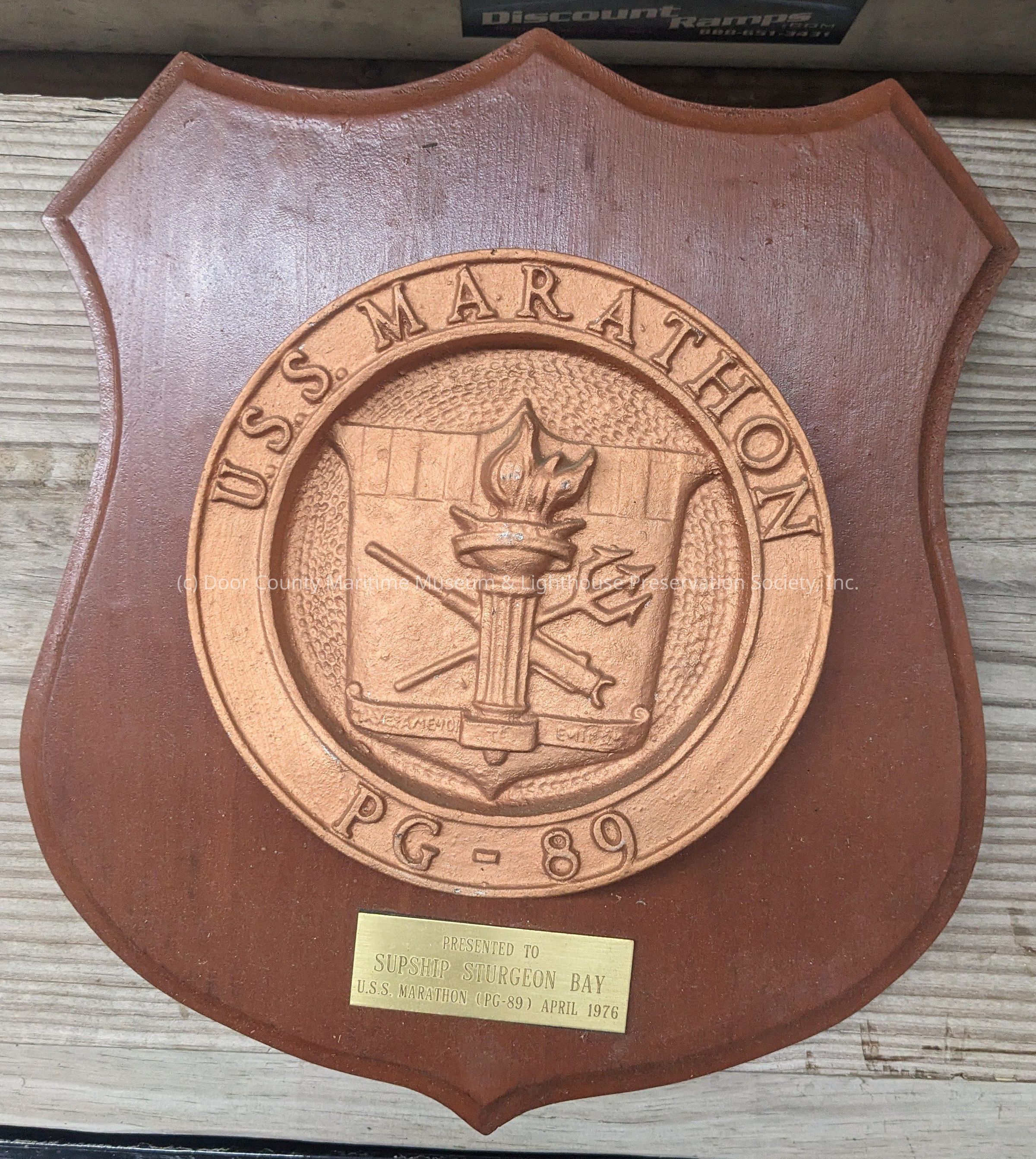 Wooden plaque in shape of a shield with an insignia in the center and text stating "U.S.S. Marathon PG-89"