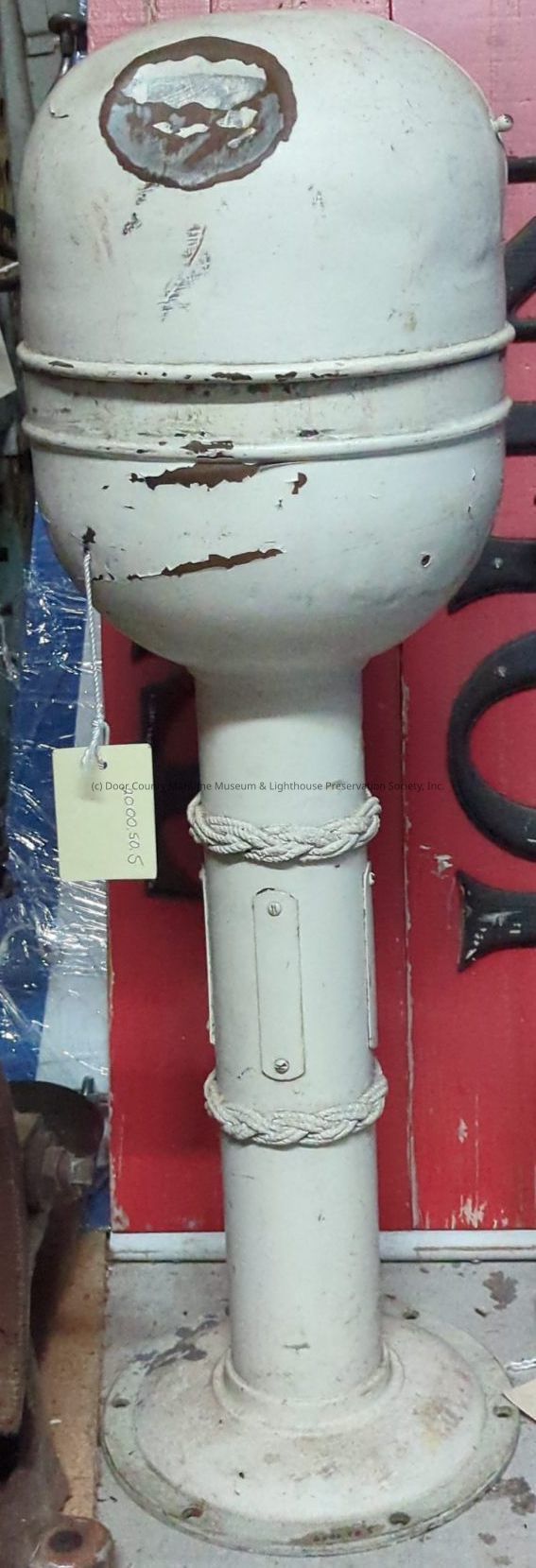 Painted white. Top is removable with sliding door. Two links of white run pedestal. Base has holes for mounting.