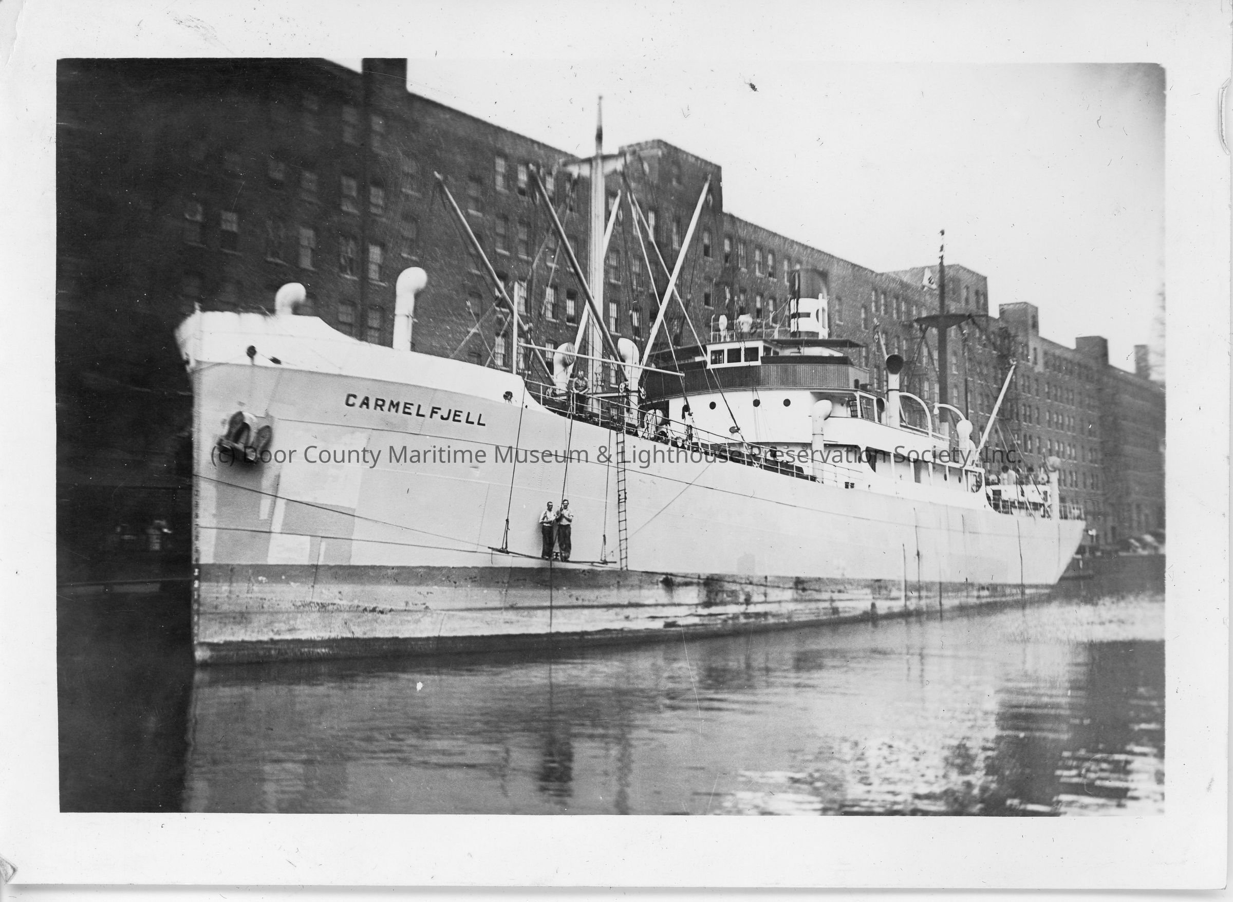 Vessel Carmelfjell docked with two men hanging off side