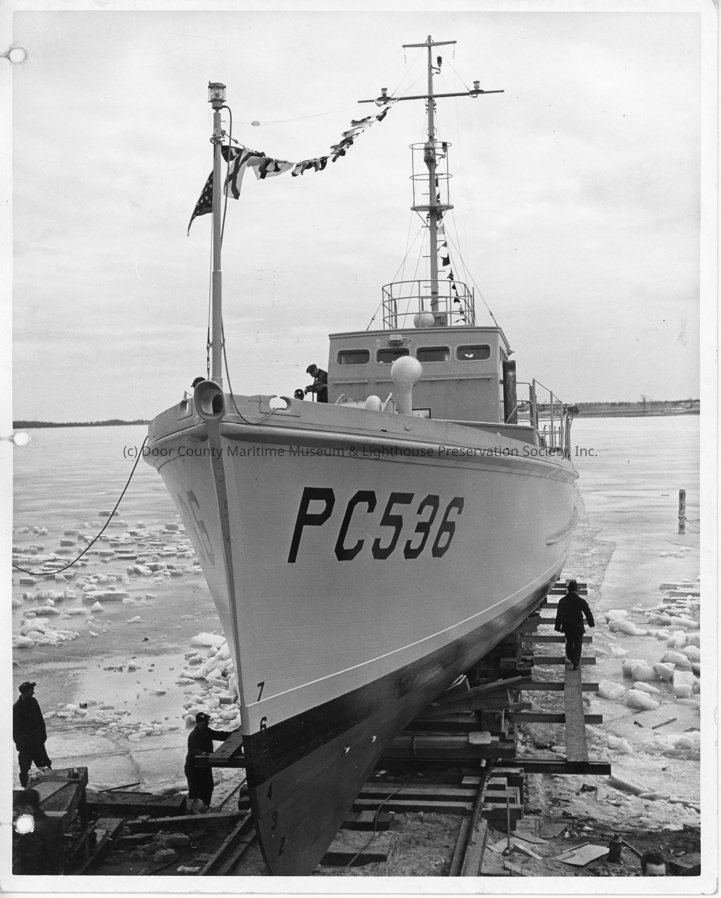 View of PC-536 bow pre-launch at Peterson Boat Works March 5, 1942