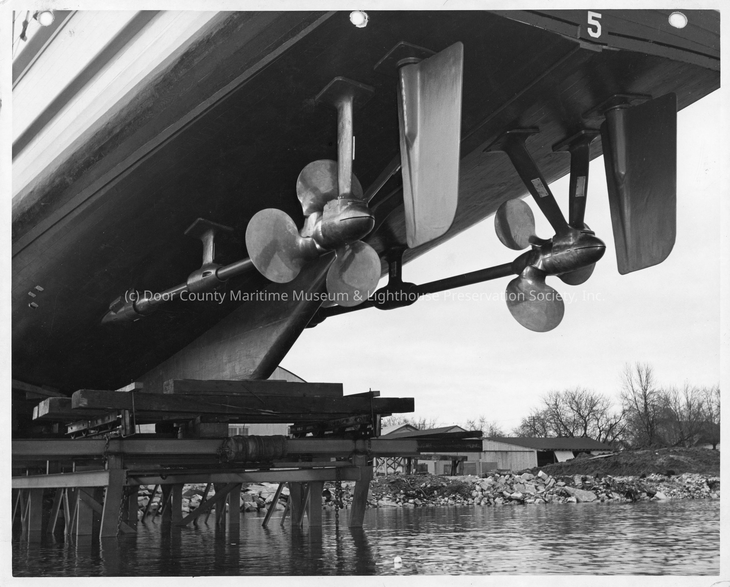 View of propellers on SC-1031 in cribbing at Peterson Boat Works