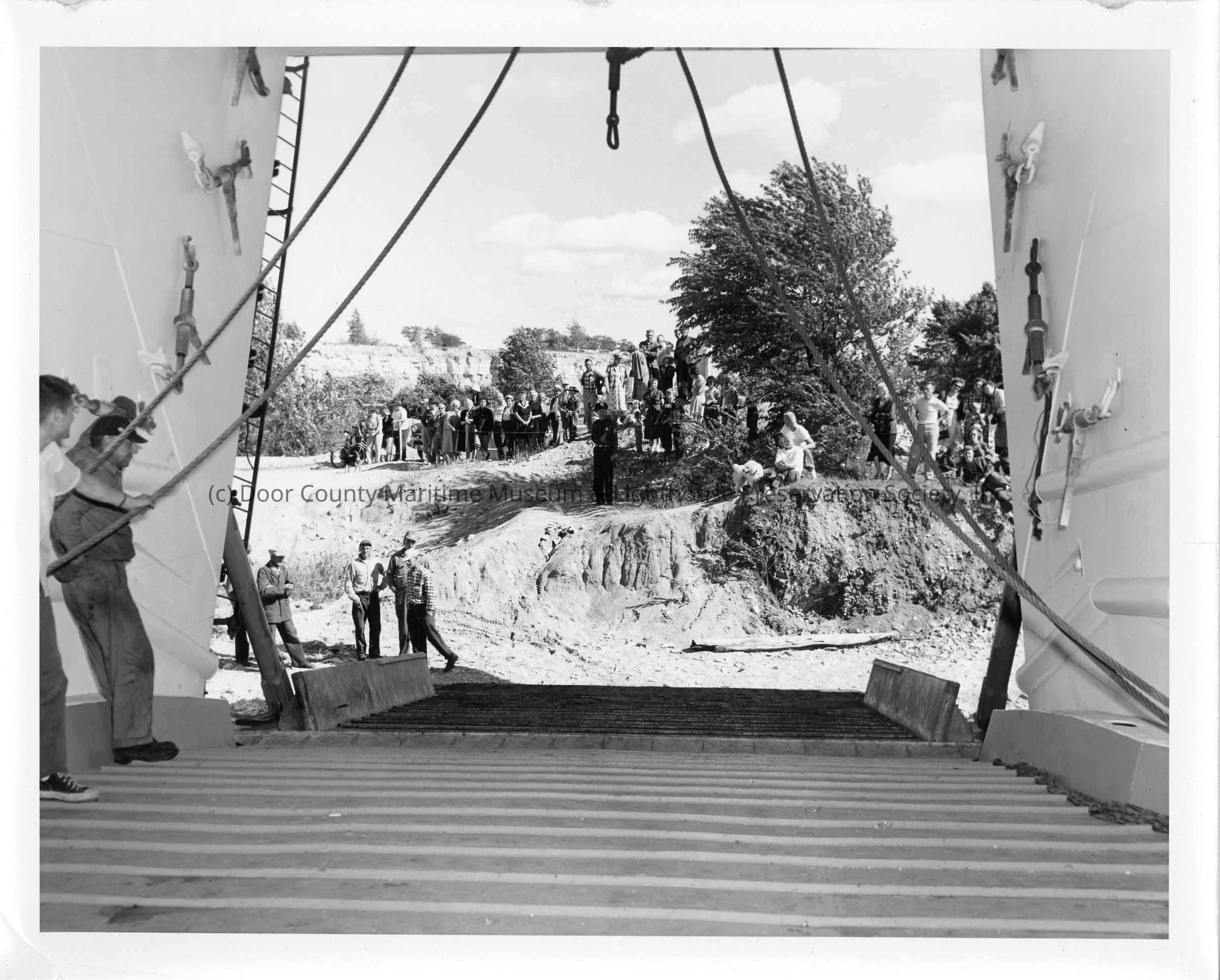 View of shore from inside of LST-1166, September 4, 1953