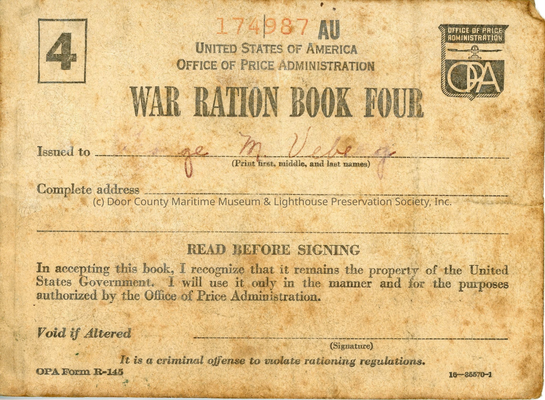 Tan paper; WAR RATION BOOK No. 4 issued to George M. Veberg; No. 174987AU; includes ration stamps.Location