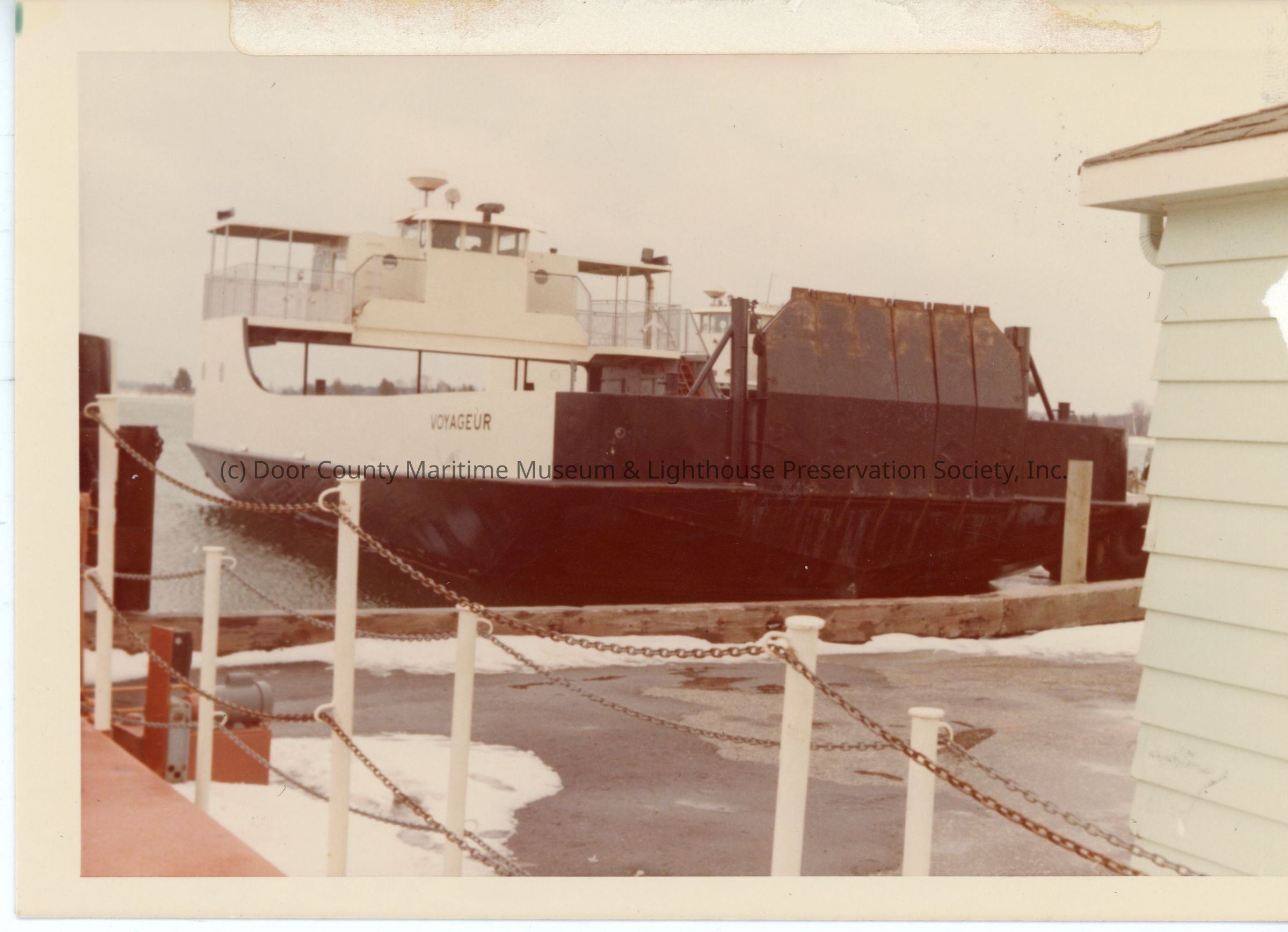 Washington Island Ferry Line Voyageur docked with ramp up January 1976
