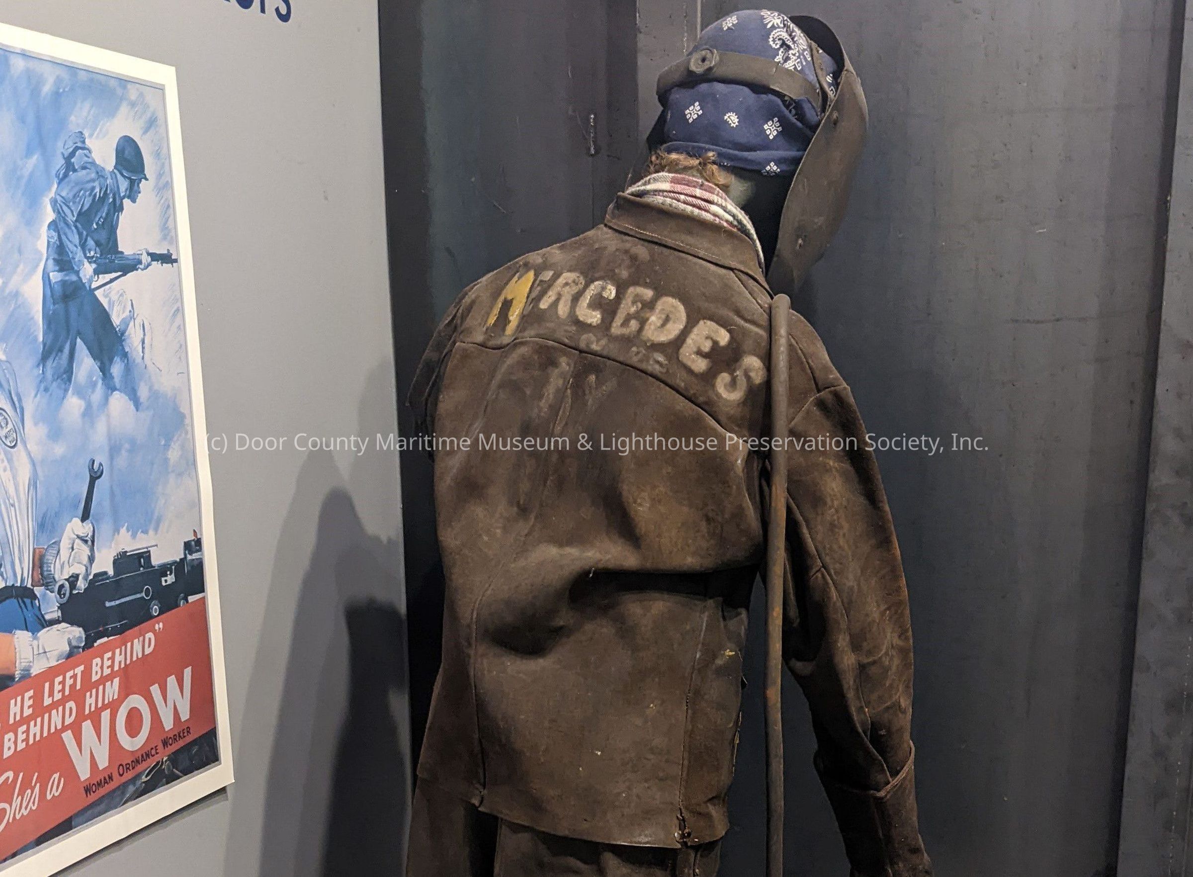Jacket used in welding; brown leather; seven metal snaps to close front opening; pockets painted yellow; one metal snap on each roll-up cuff; "MERCEDES" painted on back;Location