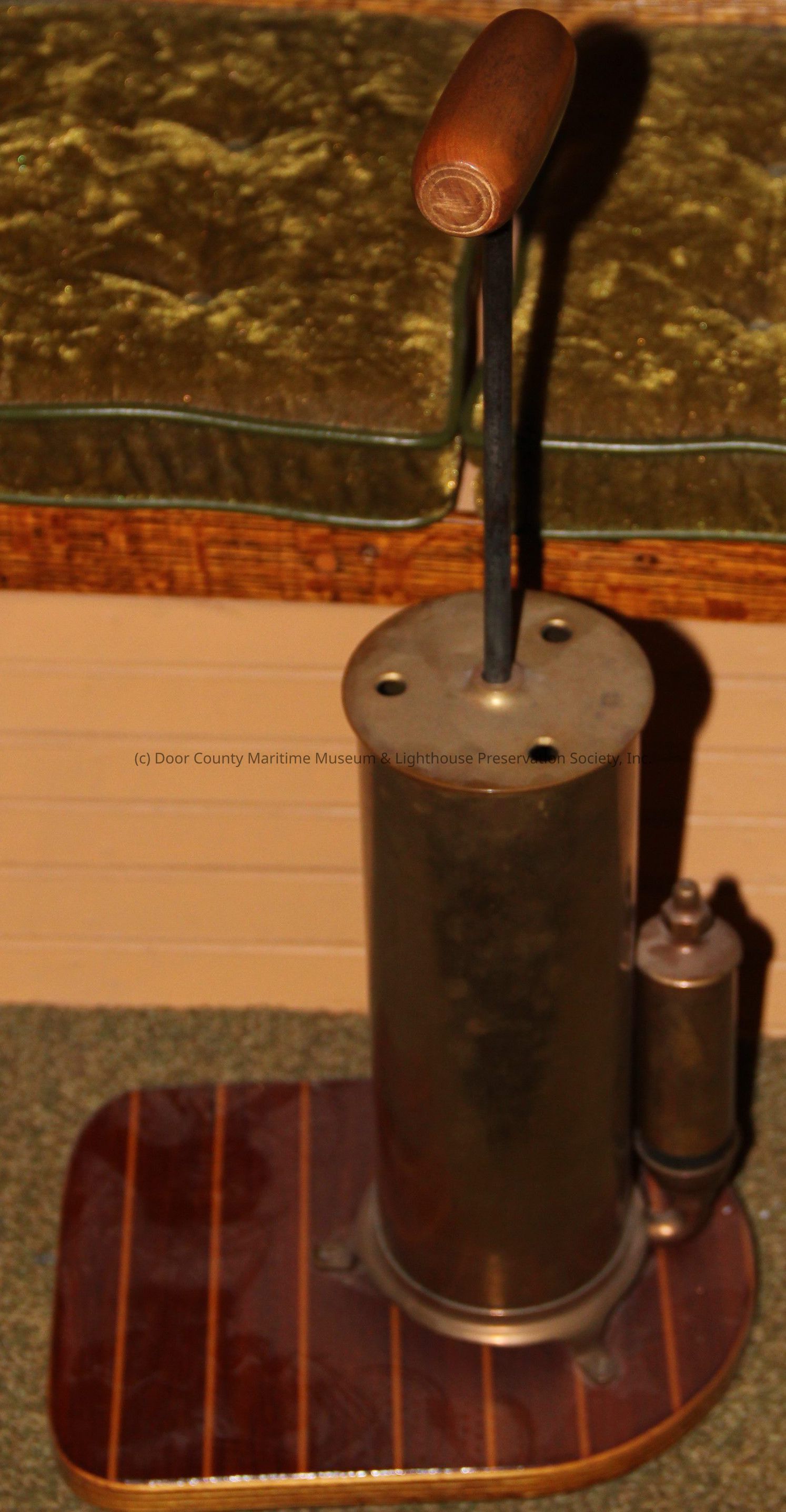 launch air whistle; screwed to varnished wood base; 12" high metal cylinder; pump has wooden handle; smaller cylinder attached to back at bottomLocation