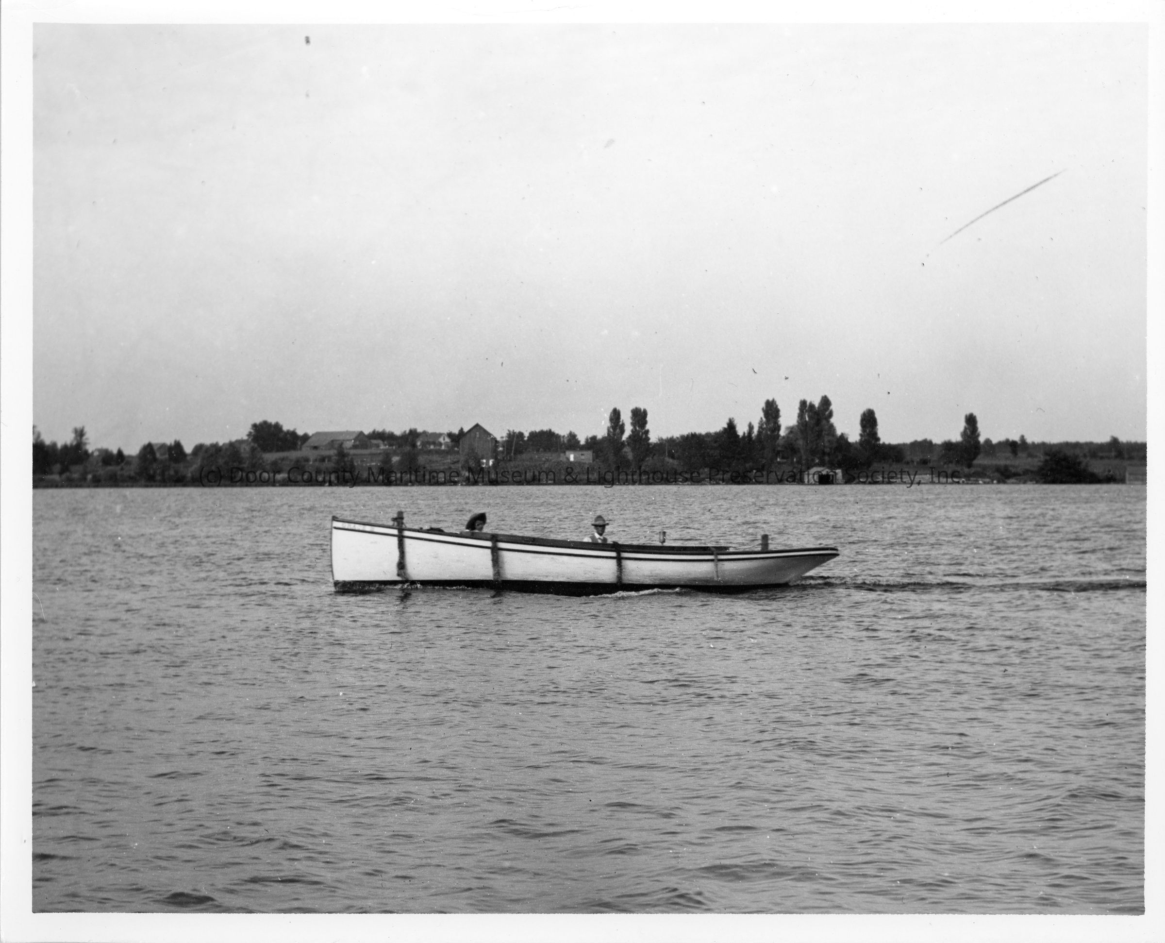 white vessel with two mean above gunwale