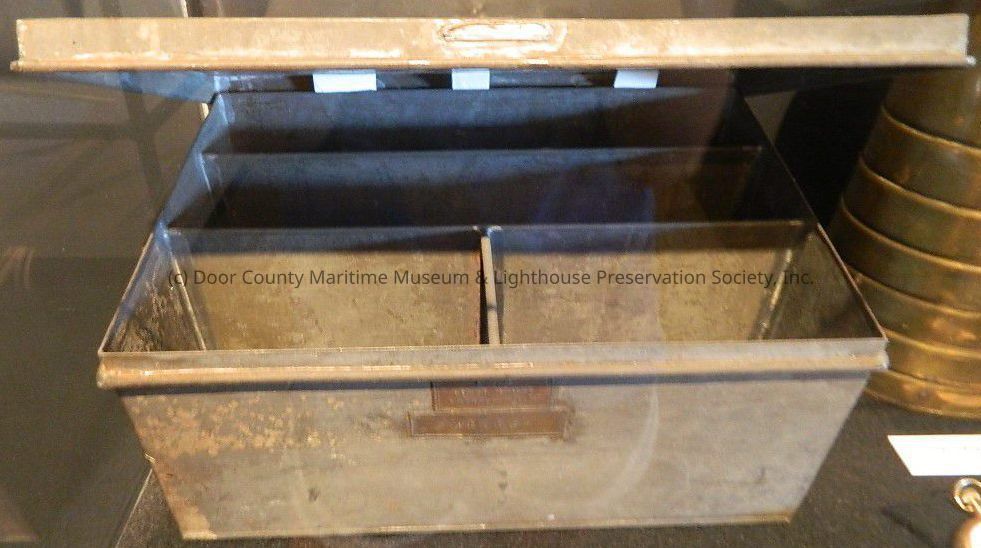 Gray metal box for holding wicks for Lighthouse Service; handle on each side; four compartments inside; "plaque" on front 'U. S. Lighthouse Establishment wicks'; rusty in spots.