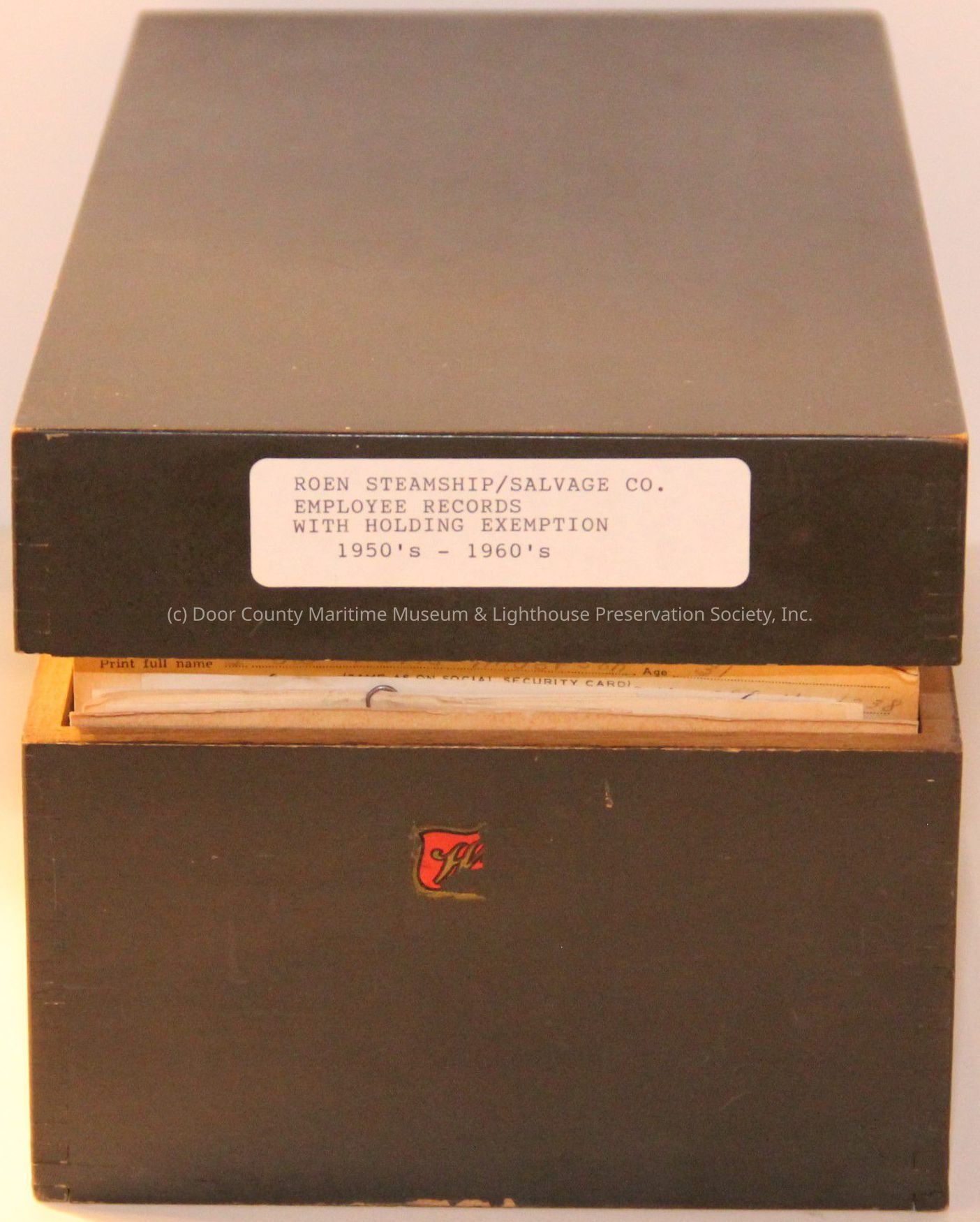 White cards; black print; withholding exemption records for employees of Roen Steamship/Salvage; light green index card dividers with alphabet ; black wooden box with hinged top.Location