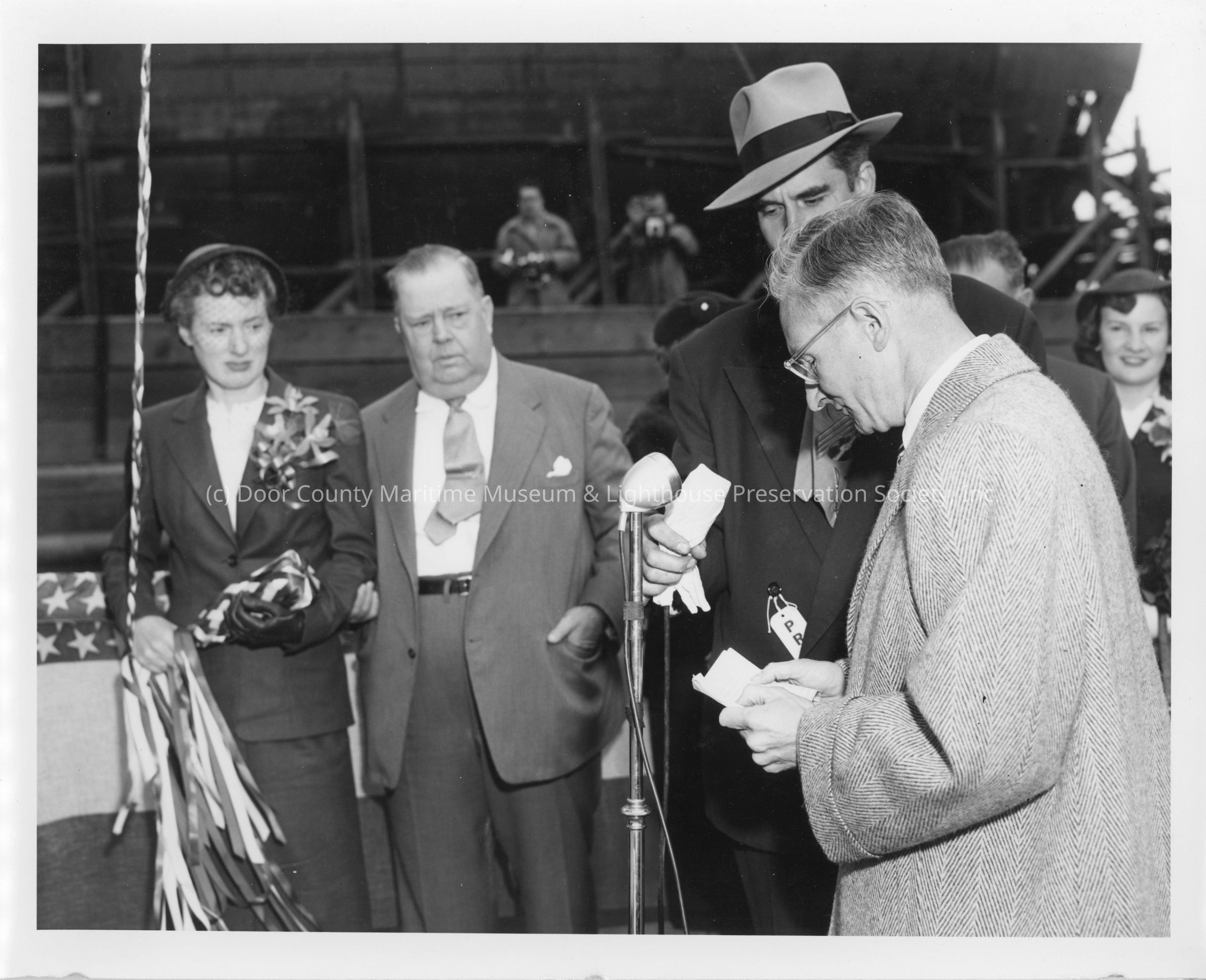 Woman holding christening bottle and man at microphone at christening of Spartan September 6, 1952Entry/Object ID