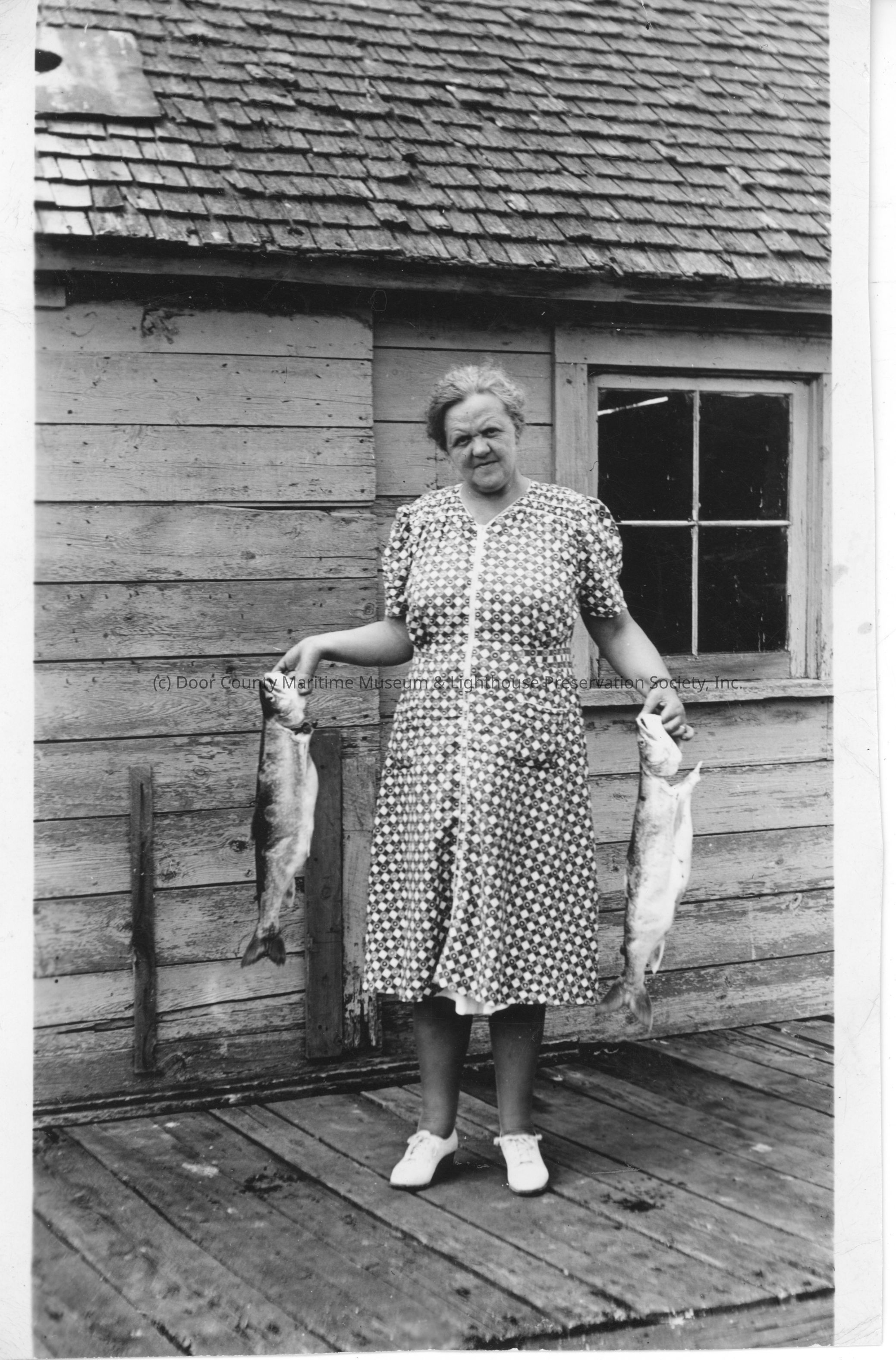 Woman in dress holding two fish while standing on dock