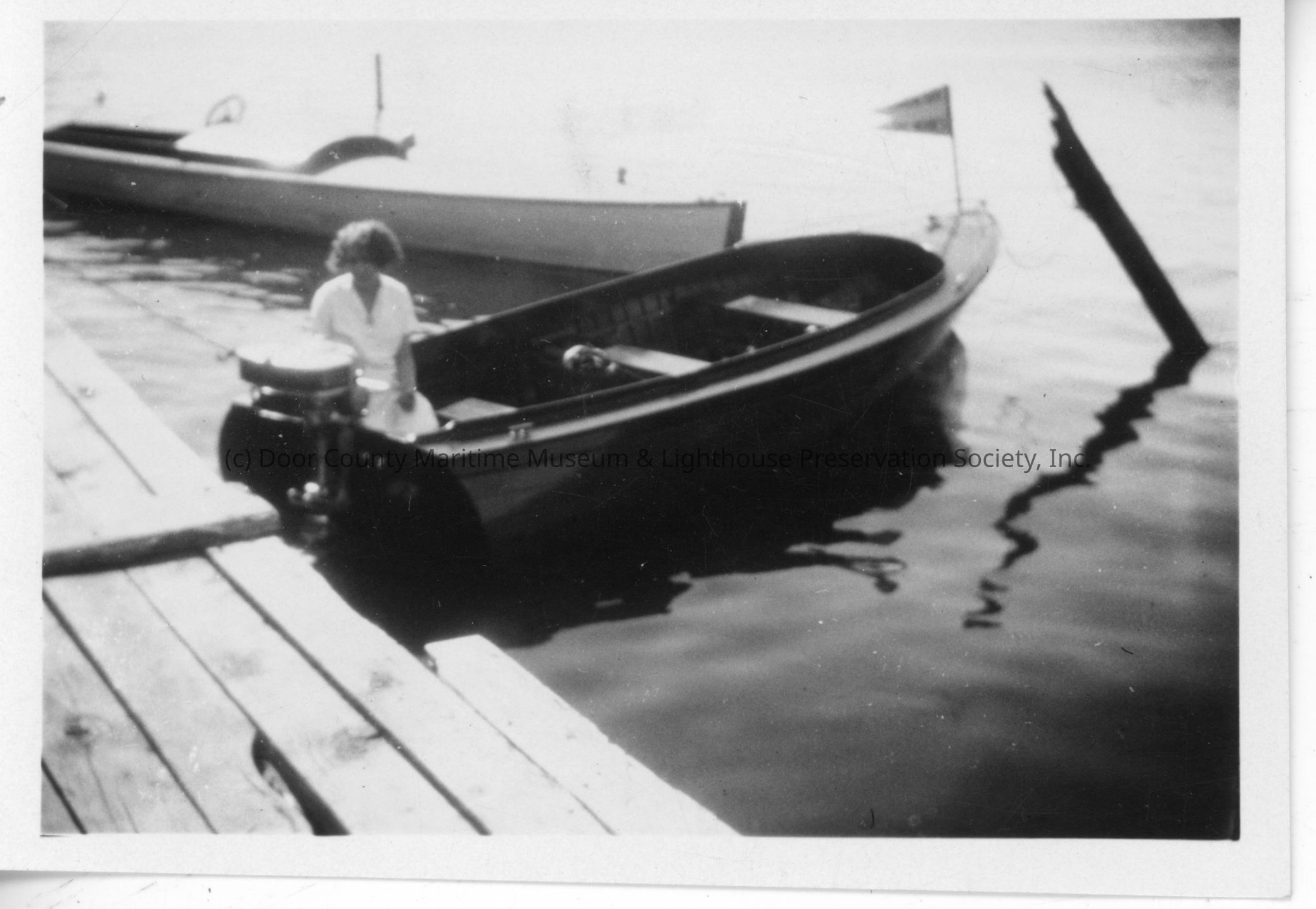 Woman sitting on docked outboard boat