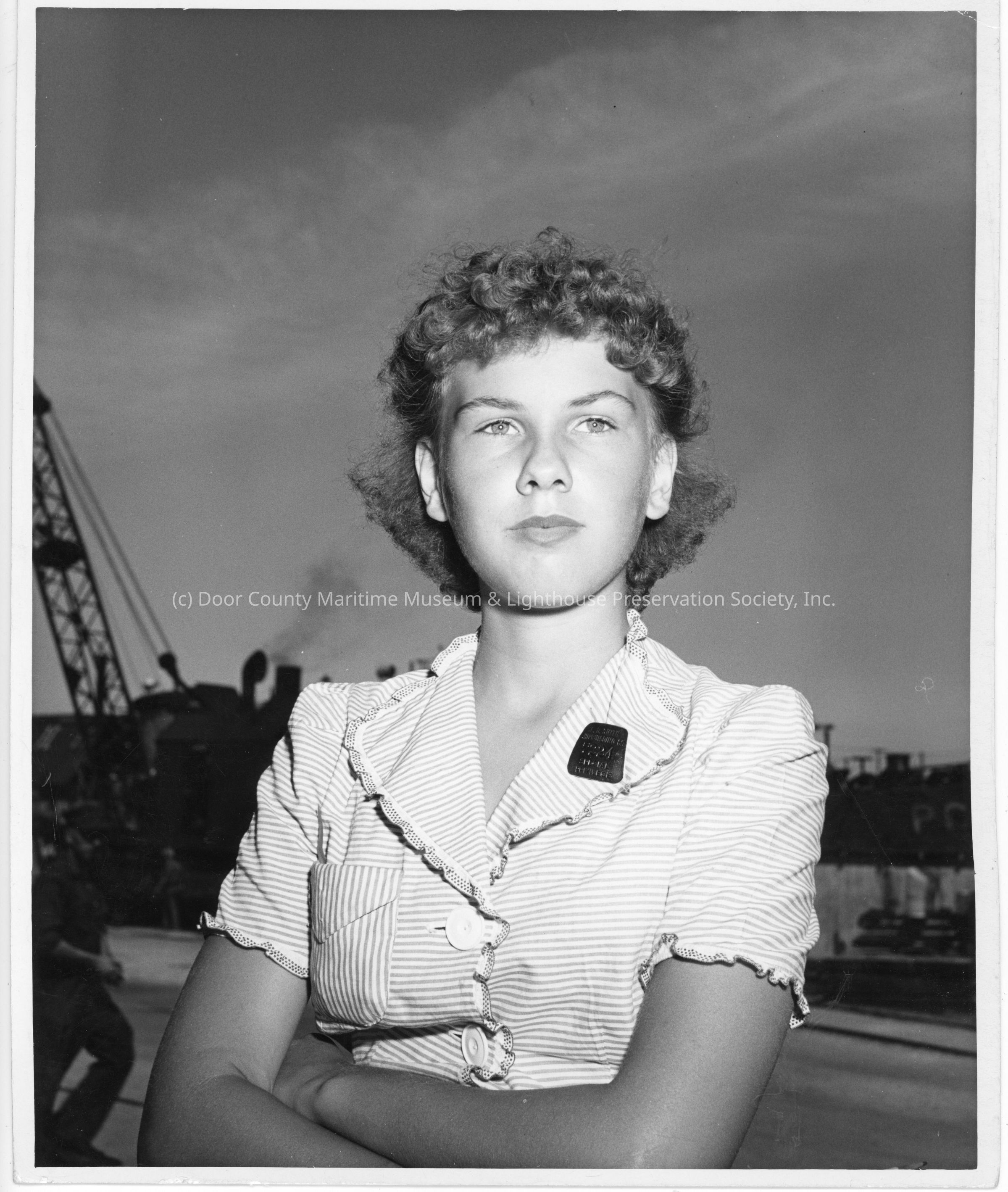 Woman wearing L.D. Smith pin with crane in backgroundEntry/Object ID