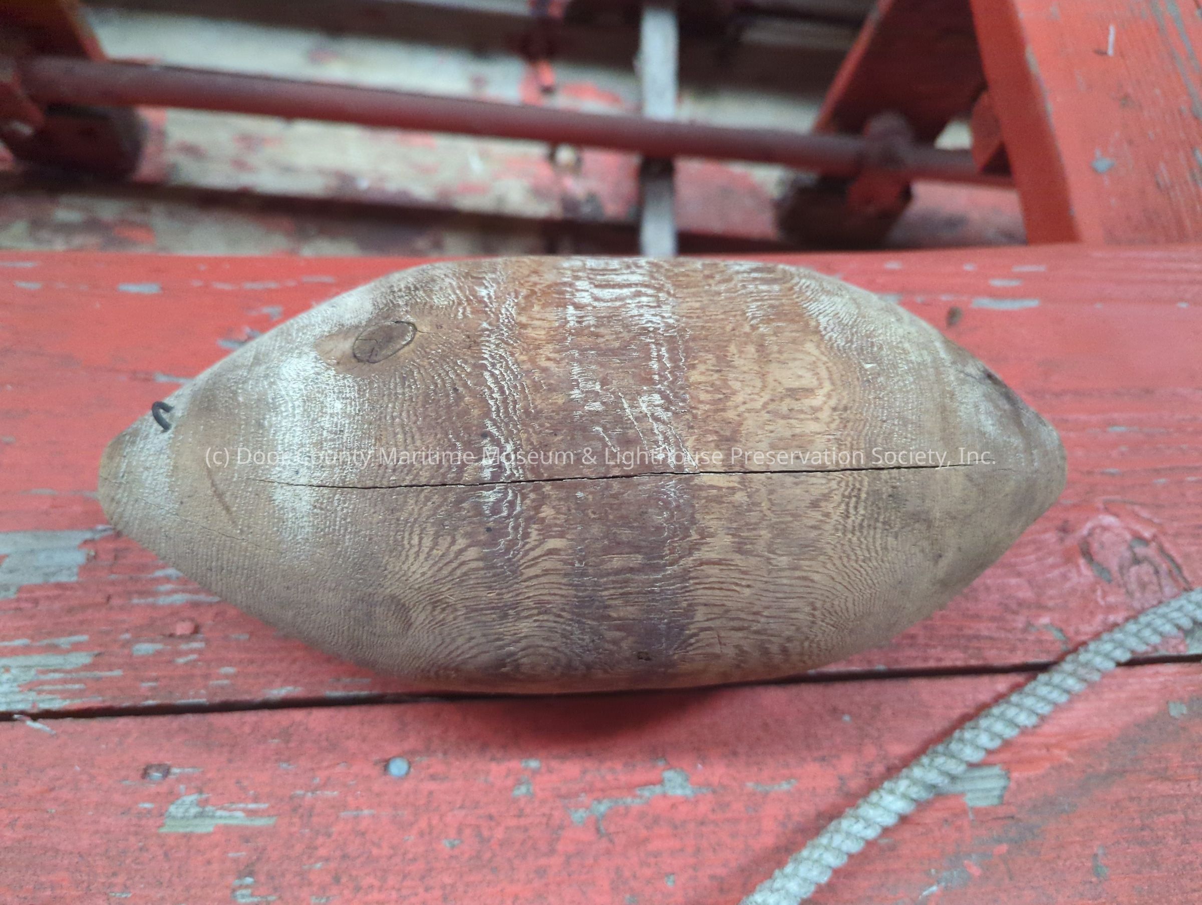 Brown wood float with white weathered paint in some areas