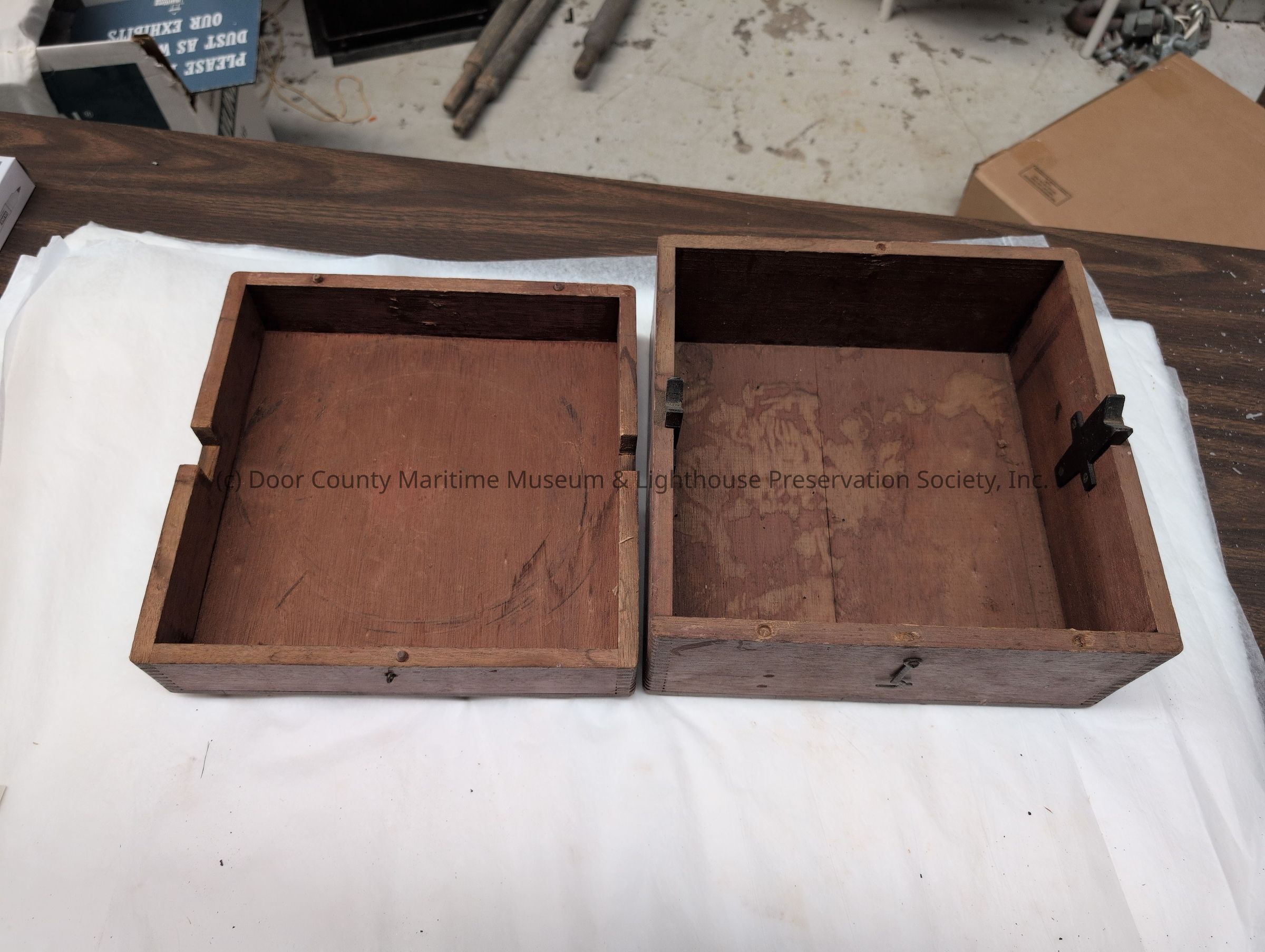 Brown wooden compass box. Nails sticking up on top. Scratch marks