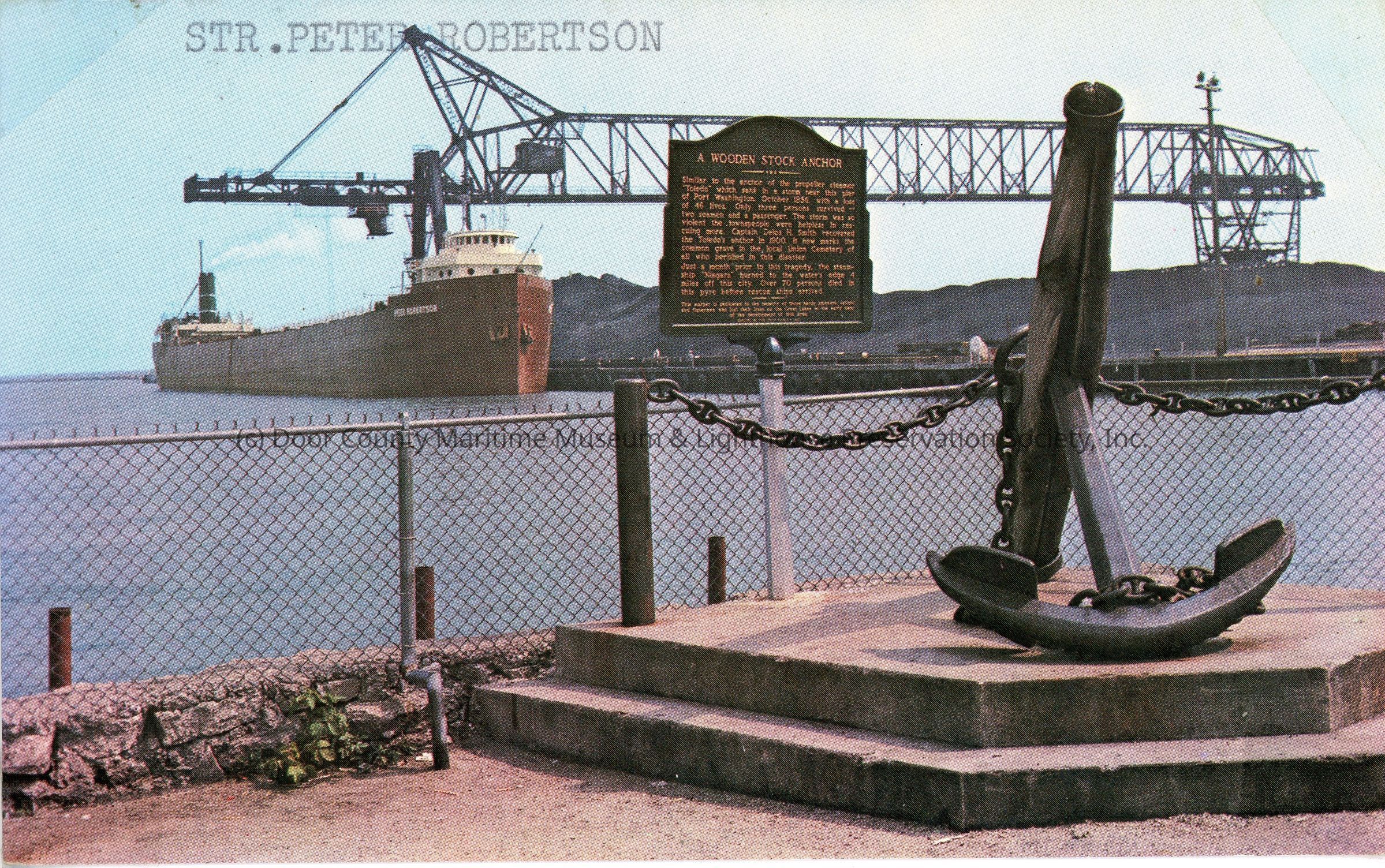 Wooden stock anchor with Peter Robertson in background at Port Washington, WI