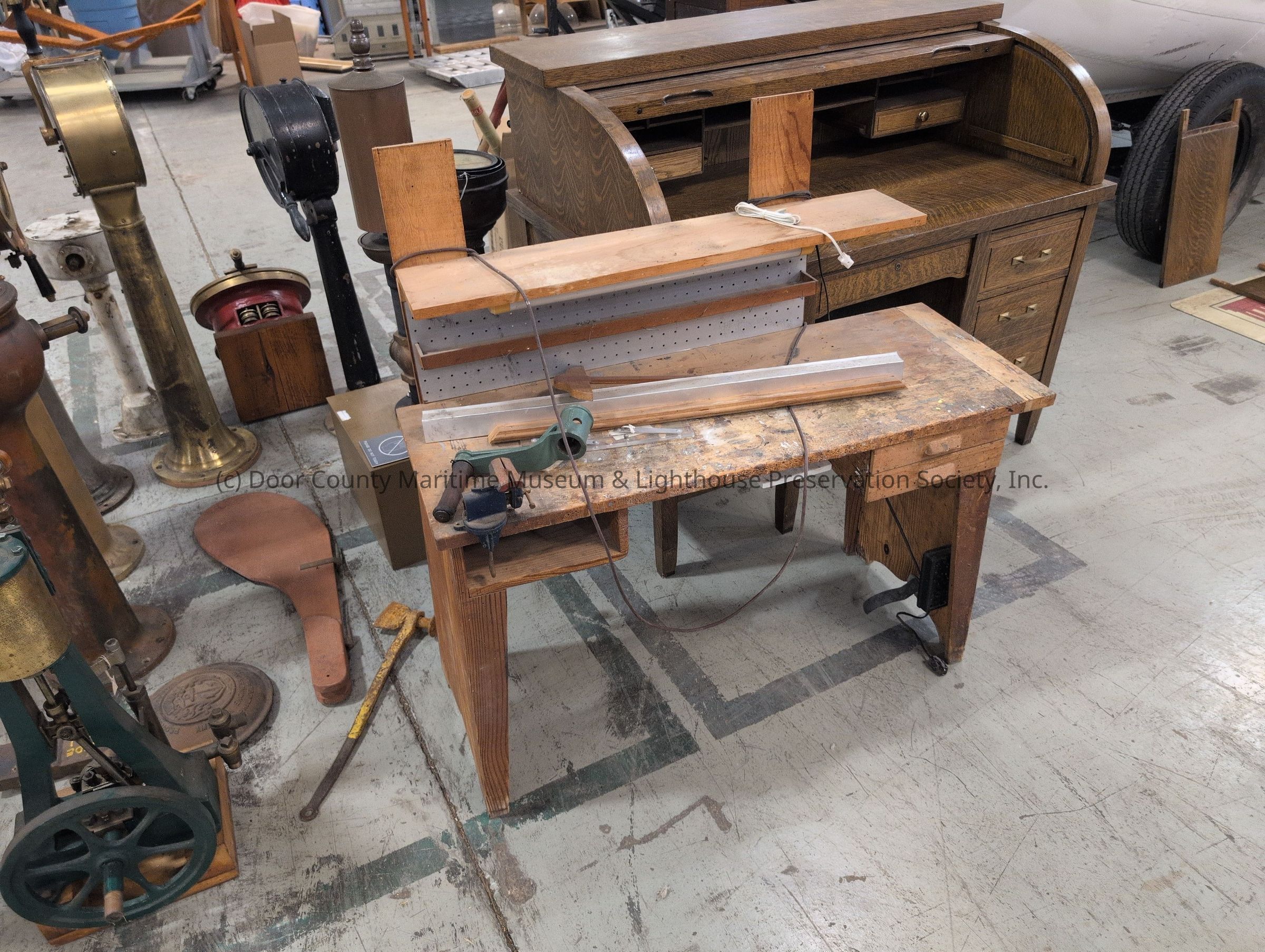 Brown wooden workbench with blue metal cabinet on top. Has small vices on each end. Various tools and storage areas for working materials are contained in wood bench area and cabinet