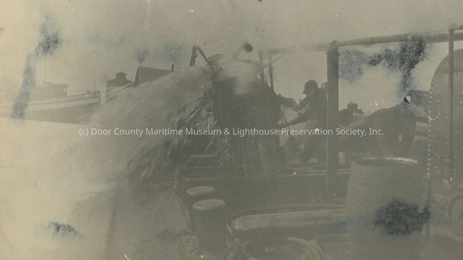 Worker operating pump on deck of unidentified vessel. Probably tug Smith.