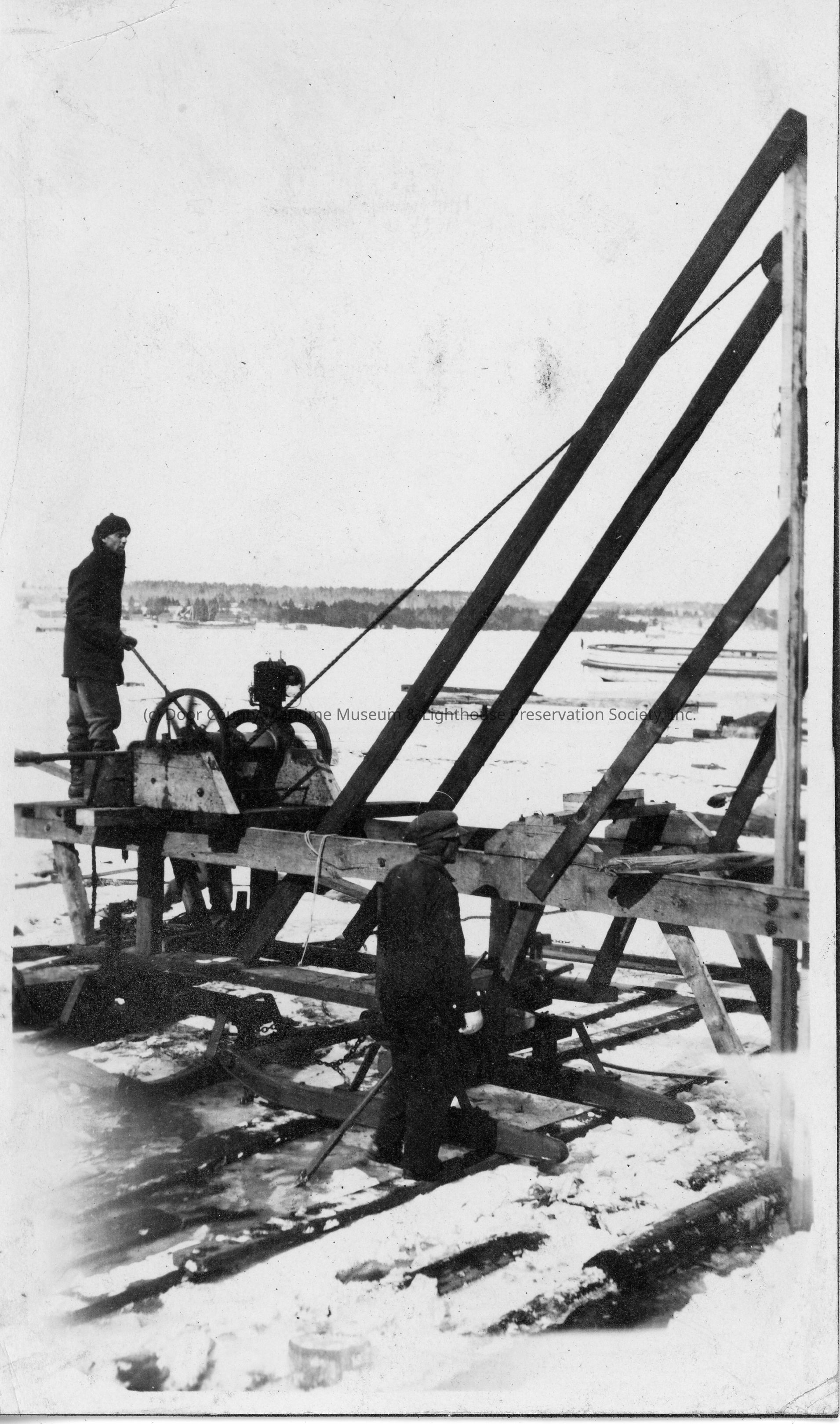 Workers at Smith quarry using crane to lift unknown item. Middle of winter at Smith Quarry, Sturgeon Bay, WILocation