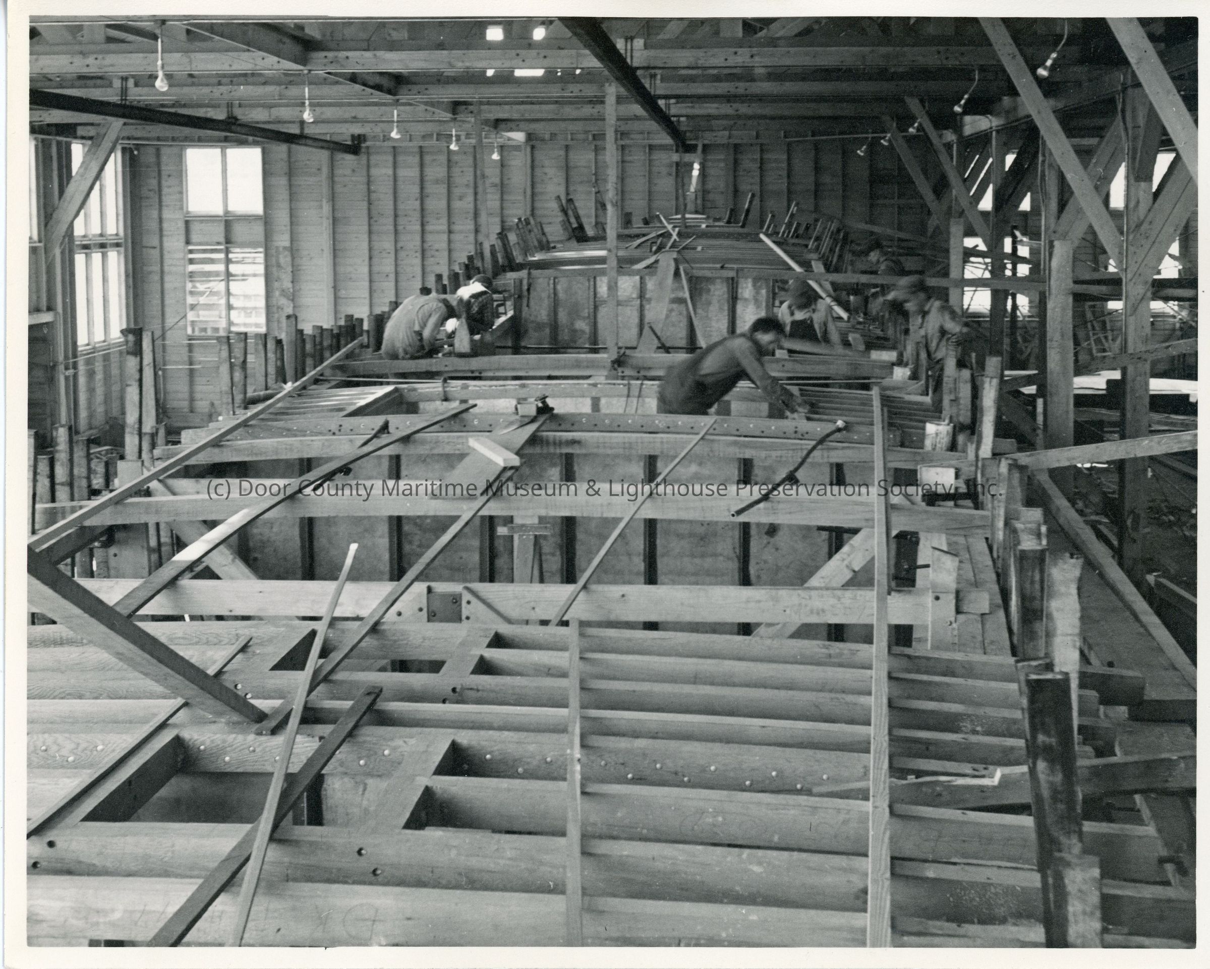 Workers constructing ship's hull at Peterson Boat Works