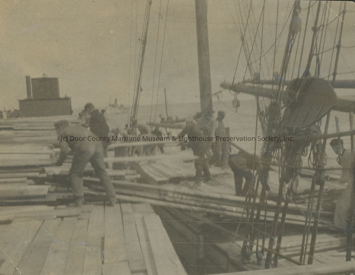 Workers loading or unloading lumber from barge to sailing ship.