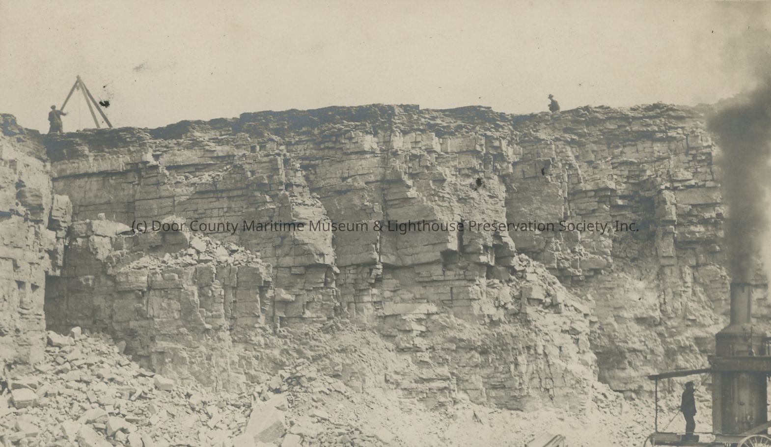 Workers are at the top edge of quarry wall, while at lower right, part of the steam shovel is visible.