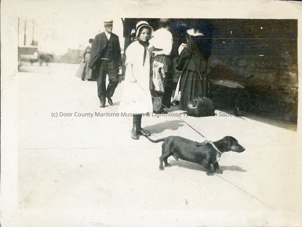 An unidentified young girl holds a dachshund on a leash with several adults behind her.